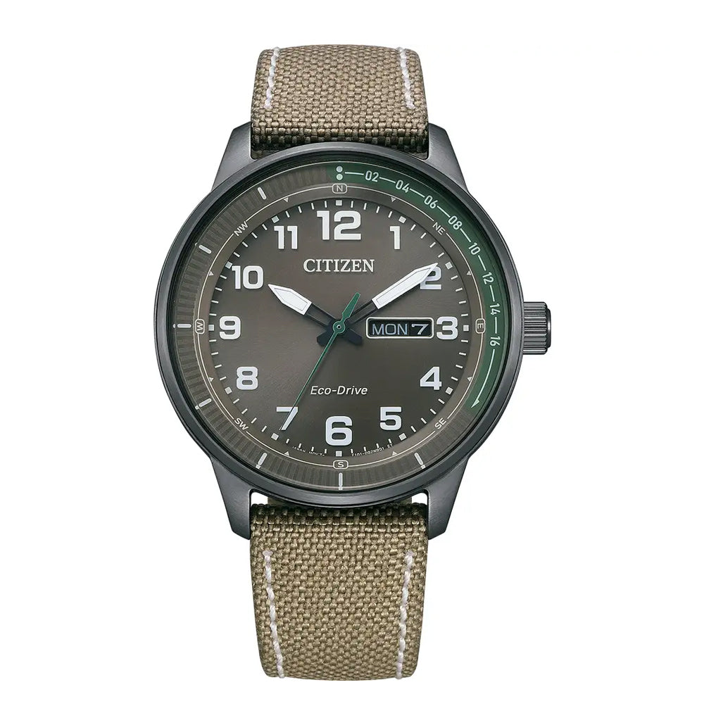 Embark on new adventures with the Weekender from Citizen, with a rugged, sporty style perfect for your outdoor escapades. Styled with a brown dial featuring easy-to-read numerals and luminous hands with a green seconds hand, as well as a handy day/date window at the 3 o'clock position. A 42mm black ion-plated stainless steel case and beige leather-backed canvas strap offers ultimate comfort on the wrist. Sustainably powered by any light with Citizen Eco-Drive technology.