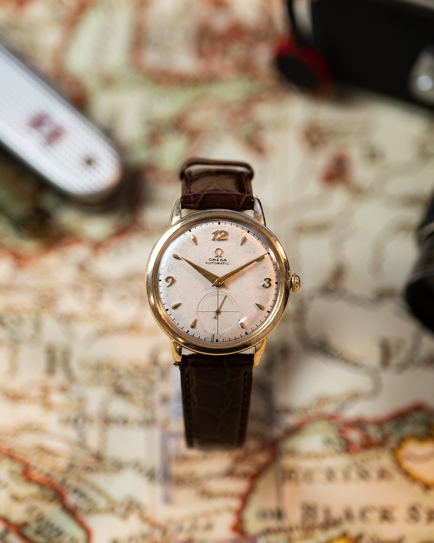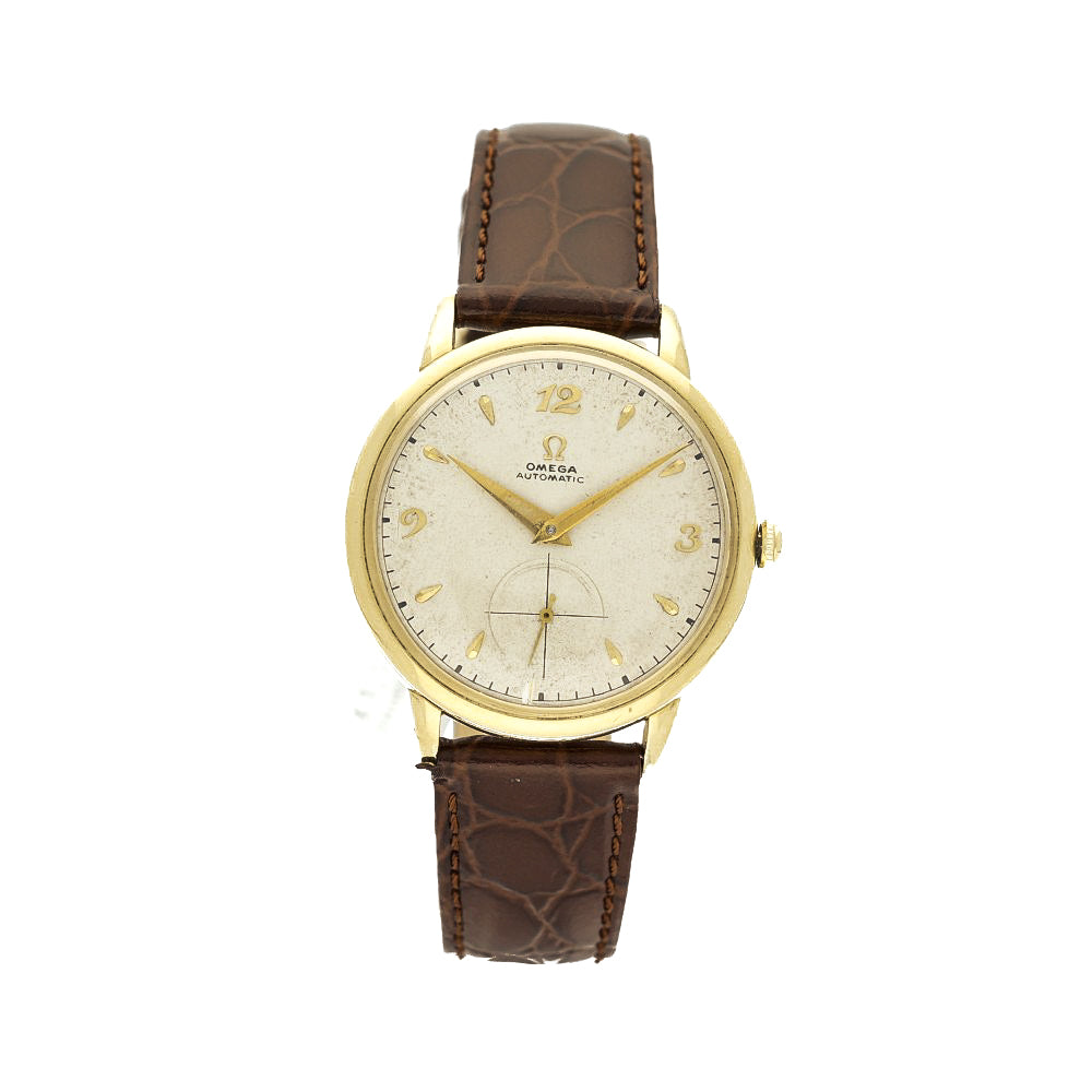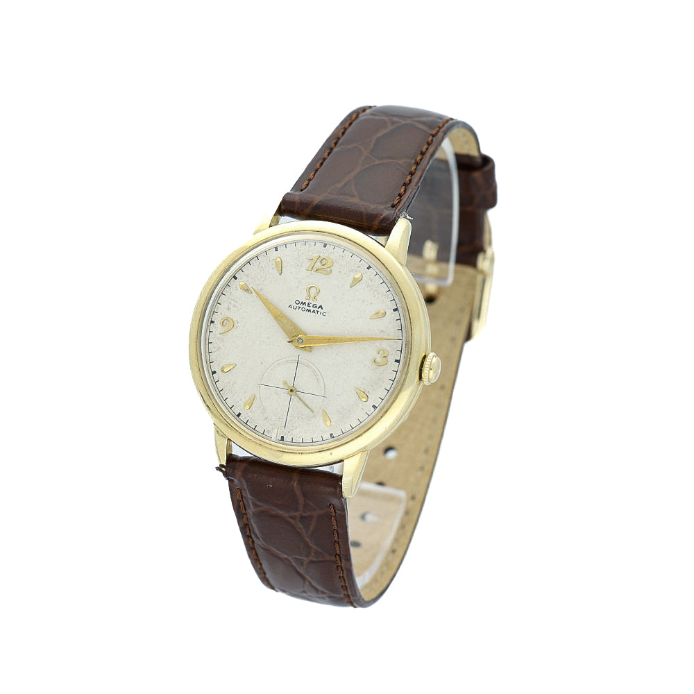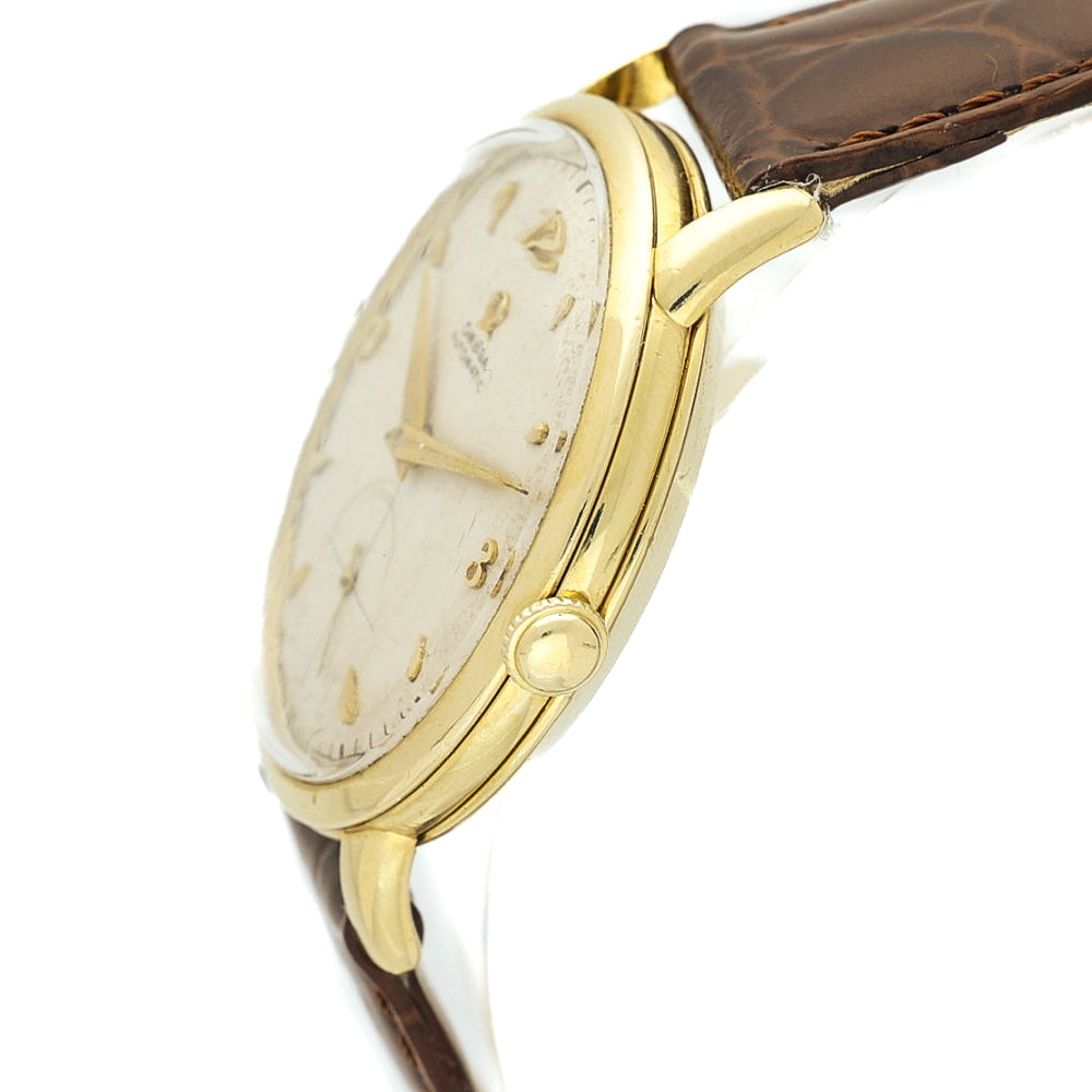 This vintage Omega timepiece from 1947 is a true collector’s gem, showcasing the brand’s pioneering spirit in automatic watchmaking. The watch features Omega’s renowned bumper automatic movement, an early self-winding mechanism that uses a semi-rotor oscillating between two springs, creating the distinctive “bump” sensation that enthusiasts love.
