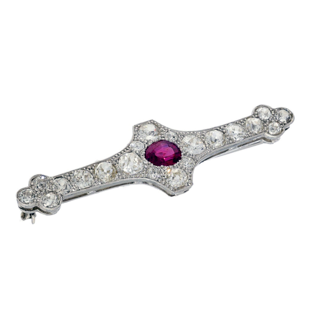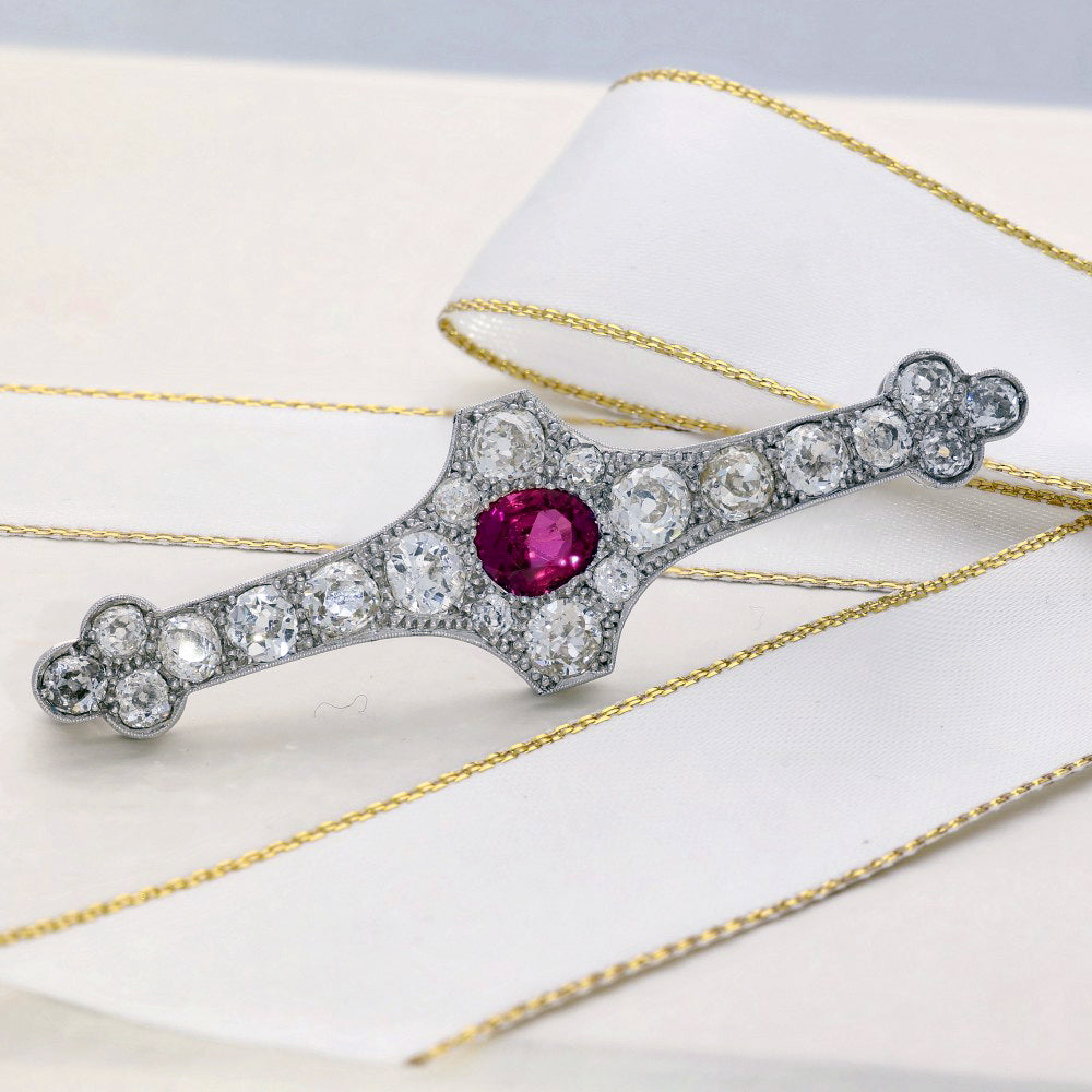 Antique 18ct & Platinum Natural Burmese Ruby and Old Cut Diamond Brooch