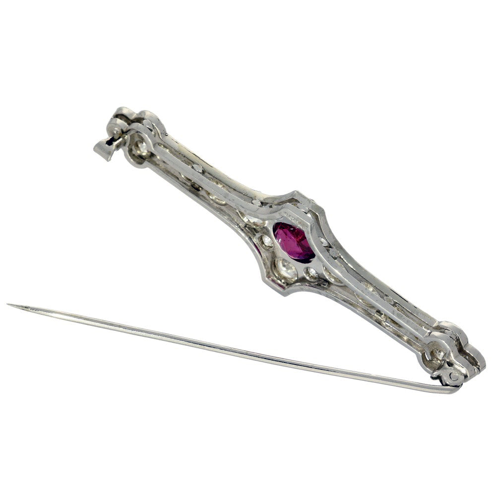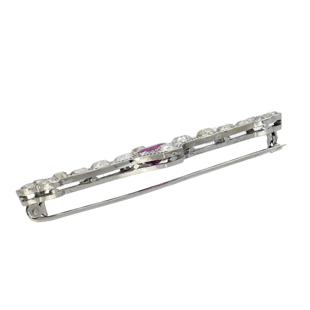 Measuring 62mm x 18mm, the brooch fastens with a sturdy pin, with a safety feature. There is no hallmark on this piece which is expected for jewellery from this age, but there is an '18ct Plat' stamp, which confirms our tests.
