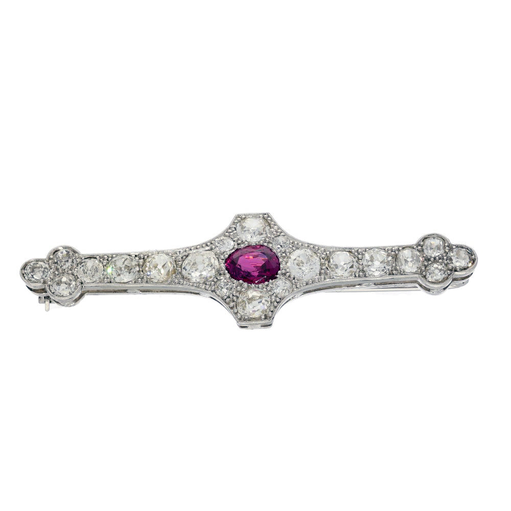 To be certain of its heritage, we have commissioned a gemmological report, which confirms our belief that this exceptional ruby, is of Myanmarese (Burmese) origin and has no evidence of any treatments to enhance its natural colour or clarity. Measuring 7.5 x 6.4 x 4.27mm it has an estimated weight of 1.72ct and described as deep purplish red, slightly included. Upon inspection the facets have some minor chips, but it is worth remembering the age of the brooch.