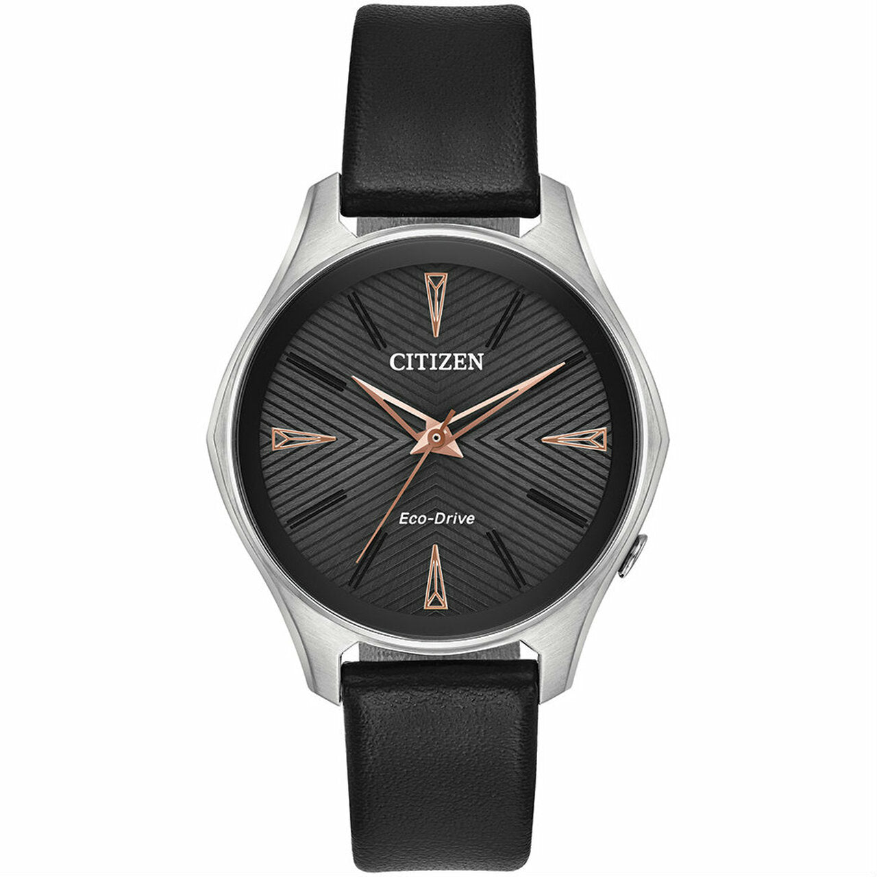 Ladies Citizen Modena watch was designed it fit her lifestyle from work to play and everything in between. The ladies watch is made from highly polished stainless steel and is fitted with a eco-drive movement. It is fastened with a black leather strap and black chevron dial with rose & black baton hour markers. The case is 36mm in width with a mineral crystal glass and is waterproof to 50 metres.