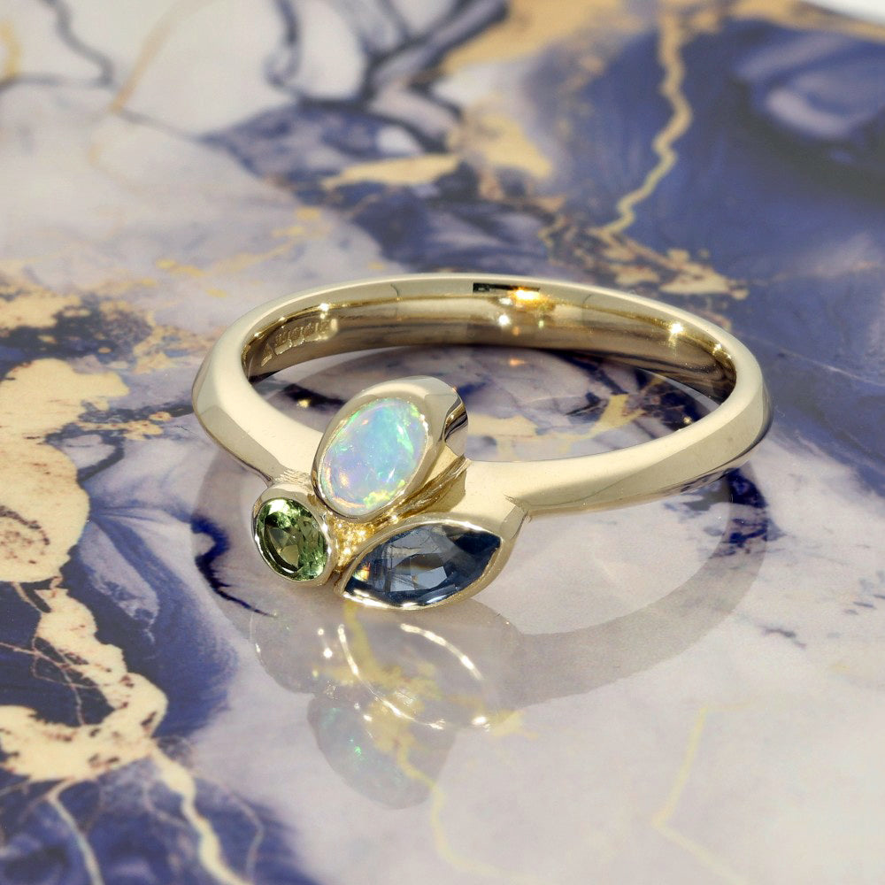 A stunning combination of natural gemstones, with a palette of blue and green tones bezel set for a smooth finish.  The marquise blue sapphire, round green garnet and oval opal form the cluster measuring approximately 10mm x 8mm.