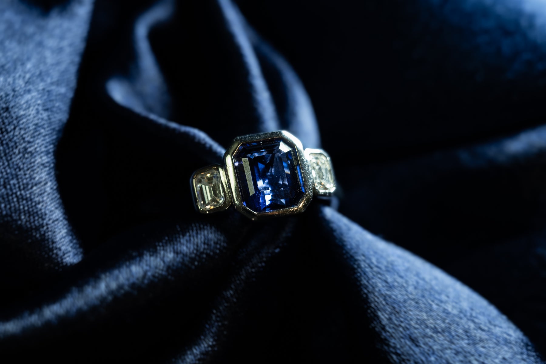 Symbolise your past, present and future with this exquisite trilogy ring, a piece of jewellery to be treasured forever. The choice of emerald cut gemstones, within the smooth bezel setting, showcases their shapes within the Art Deco inspired design.