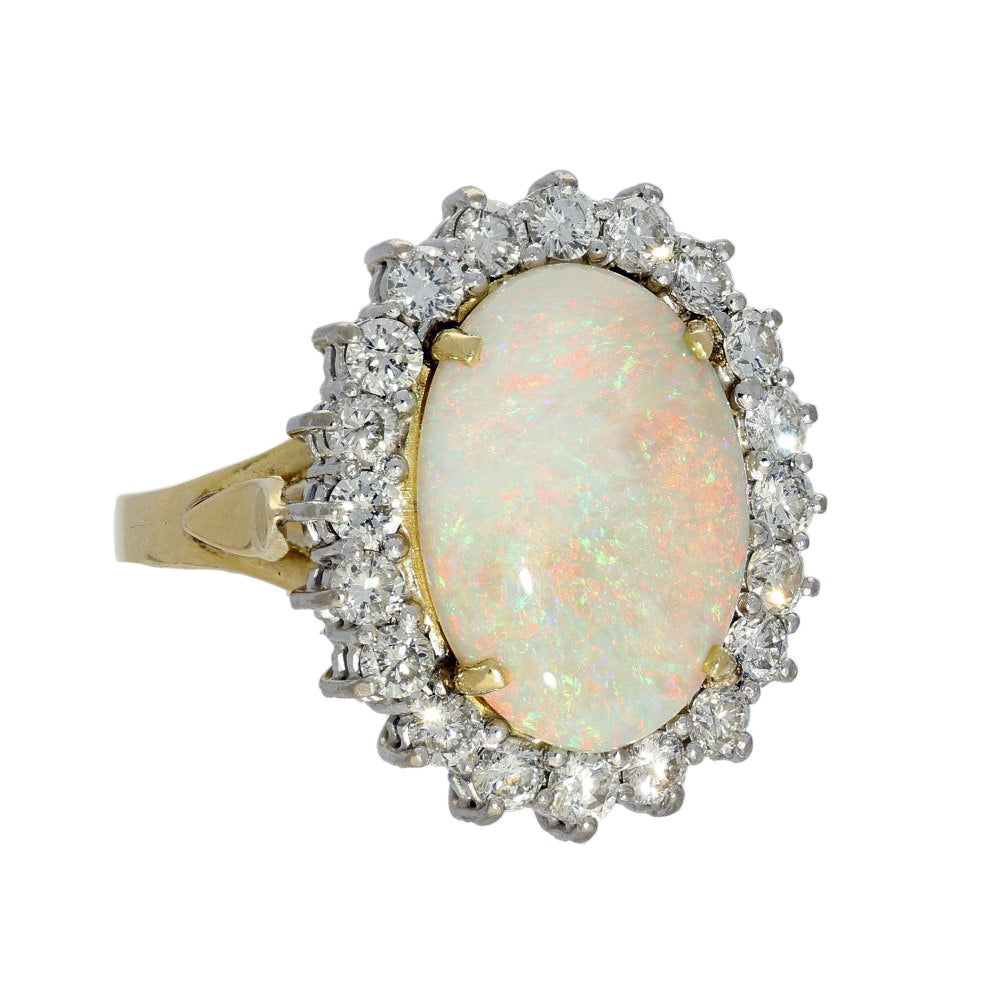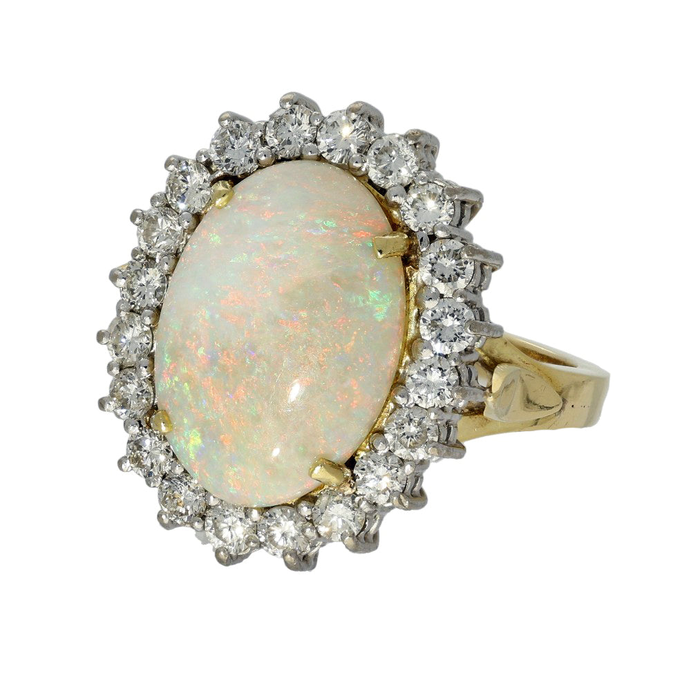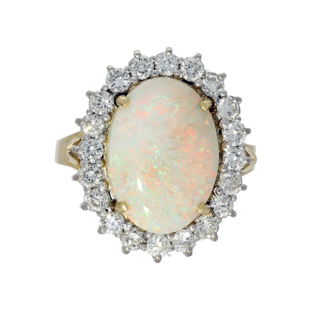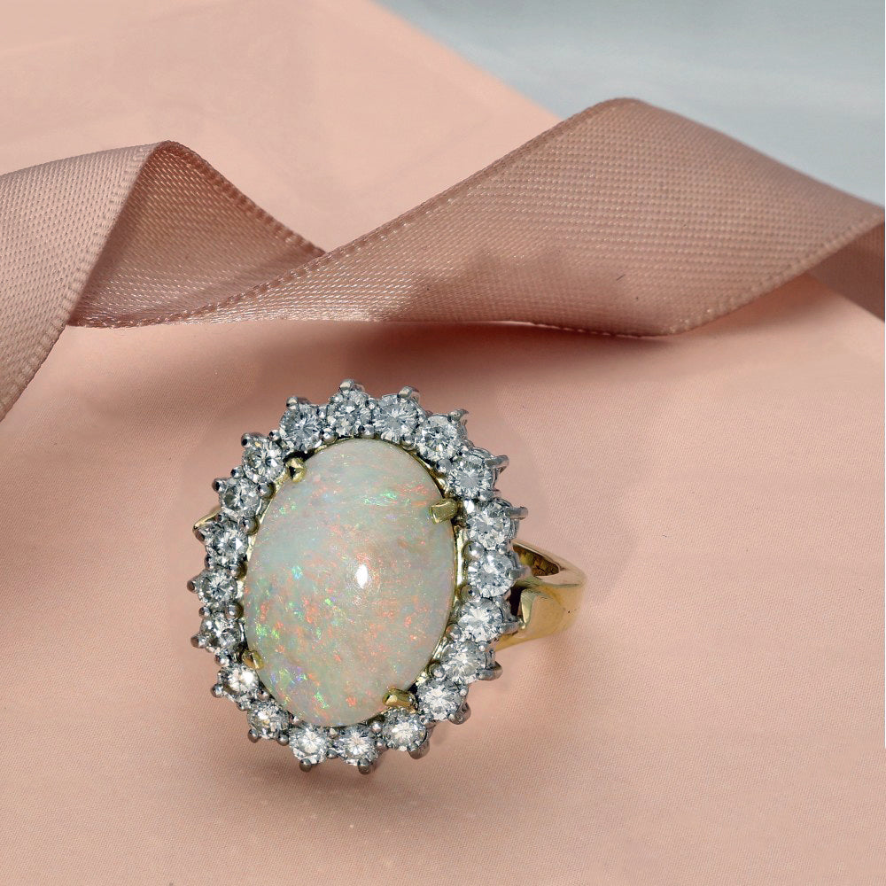 This gorgeous ring features a stunning 4ct oval shape opal, where the white base colour has a wonderful array of colourful flashes as it catches the light.  Surrounded the opal is a halo of claw set round brilliant cut diamonds, in a white gold setting.