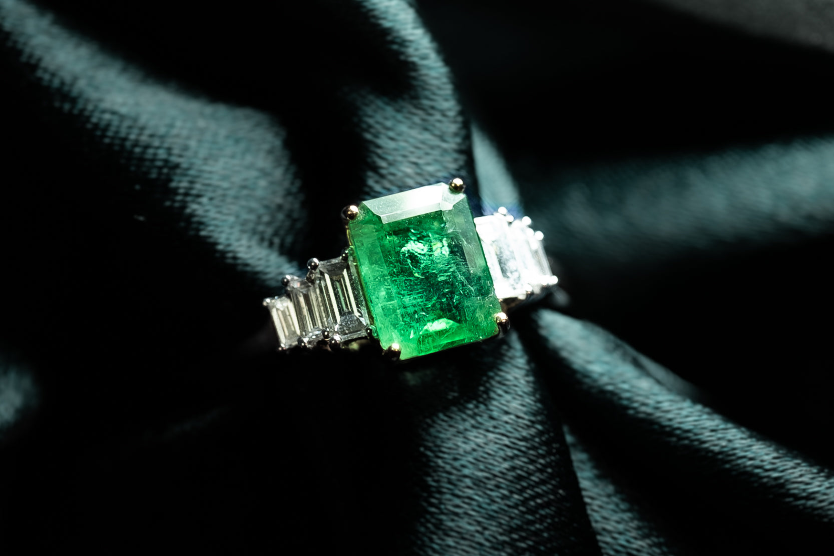 An Art Deco inspired 7-stone ring, with a glorious large green emerald taking centre stage.  White gold claw set baguette cut diamonds, form a flattering graduated stepped design which joins the 18ct yellow gold ring.