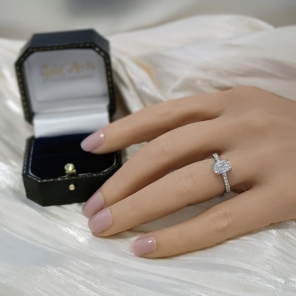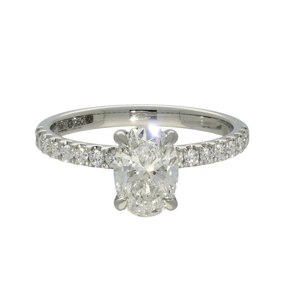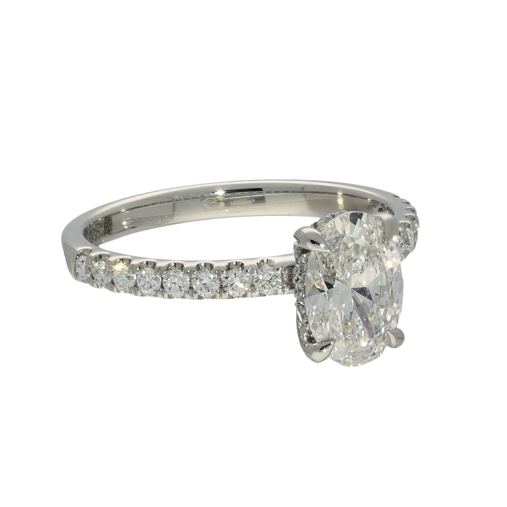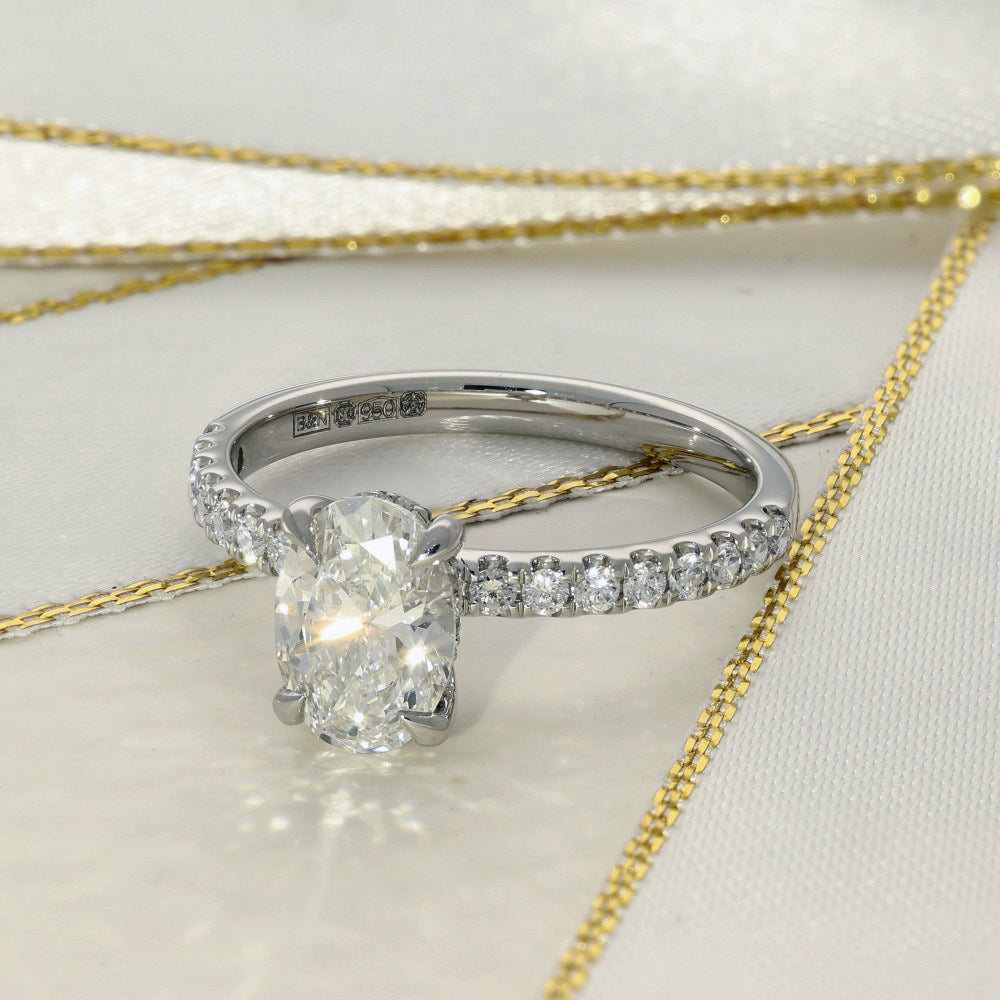 A stunning solitaire ring, with the beauty of the oval brilliant cut amplified by twinkling smaller diamonds on the hoop of the ring.  The laboratory-grown diamonds of superior quality are hand-set in an elegant platinum mount.