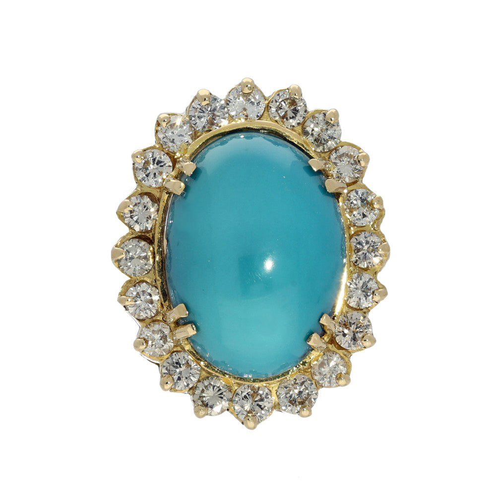 This fabulous statement ring combines a huge cabochon turquoise with a glittering halo of diamonds.