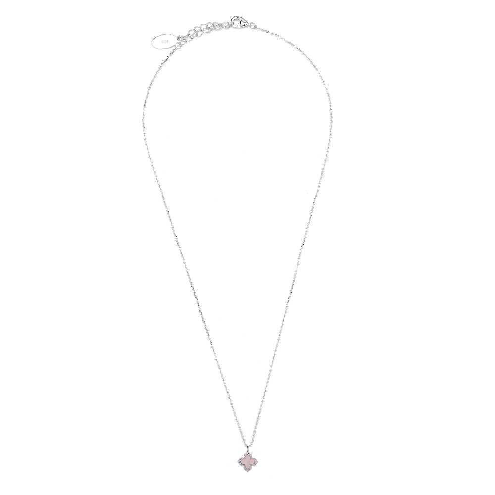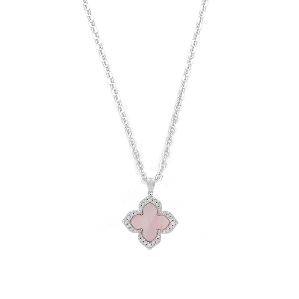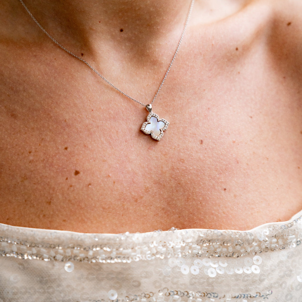 Embrace timeless elegance with the Sydney Soirée Fairwater Pendant. This exquisite piece showcases an iridescent mother-of-pearl pointed four-leaf clover, beautifully adorned with shimmering stone set edging on both sides. Crafted from Rhodium Plated 925 sterling silver, this double-sided pendant gracefully hangs from a 45cm chain featuring a sliding ball adjuster for a customised fit.