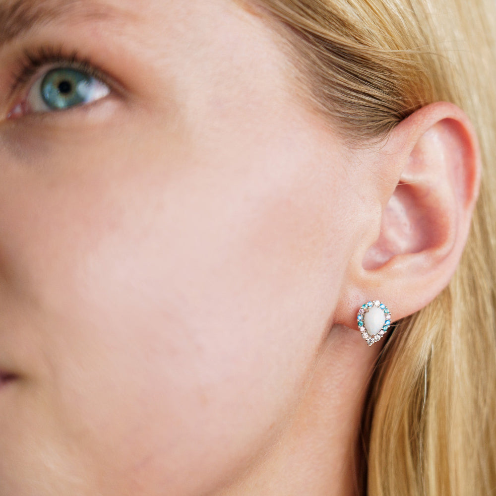 A sparkling halo of soft, multi-coloured stones dances around the opal, creating a magical burst of colour and light with every movement. Measuring approximately 11mm high by 8mm wide, they're the perfect size to make a statement while still feeling effortlessly feminine.