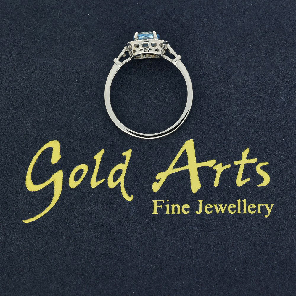 A richly coloured oval aquamarine shimmers within the centre of this stylish dress ring. A halo of round brilliant cut diamonds with a little diamond on the shoulder all add to the sparkle of the ring.