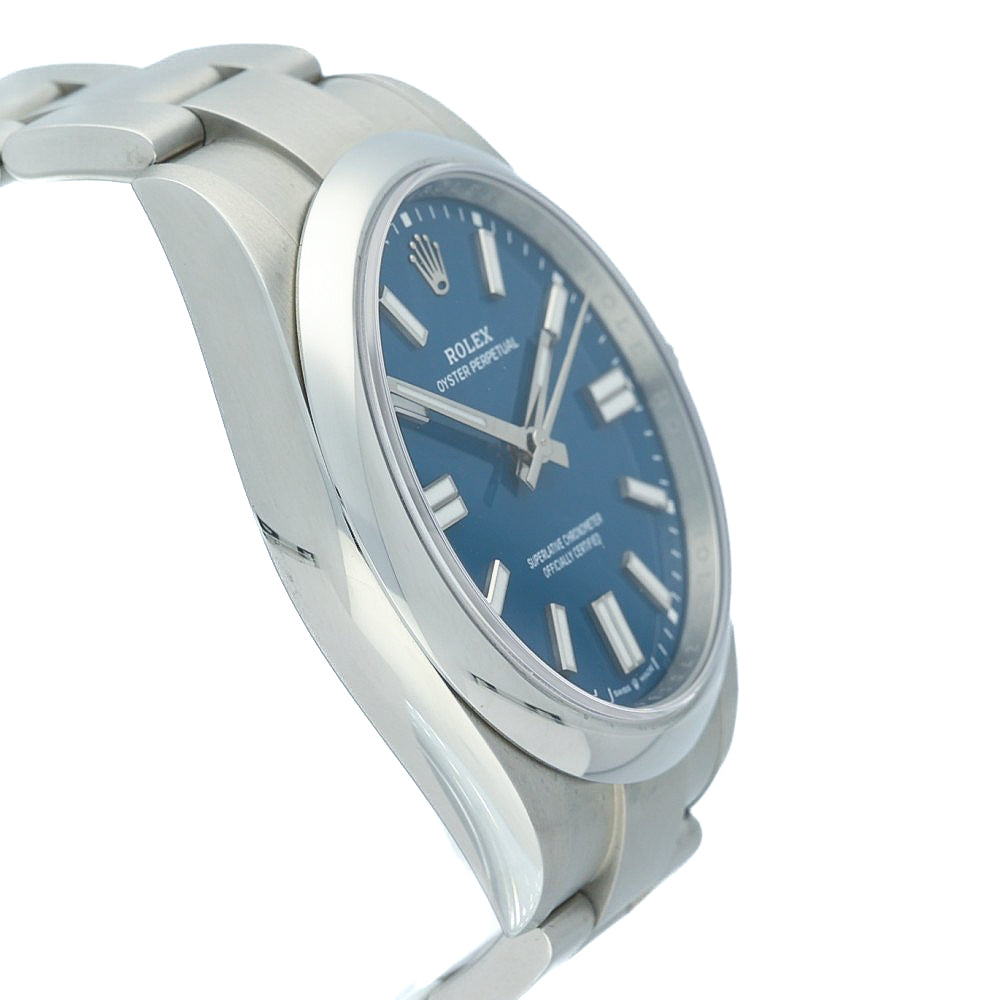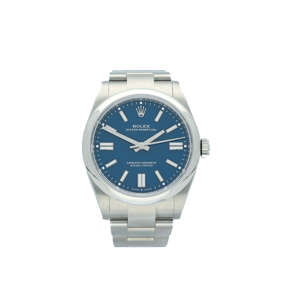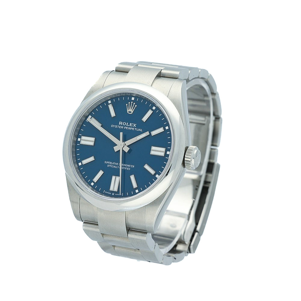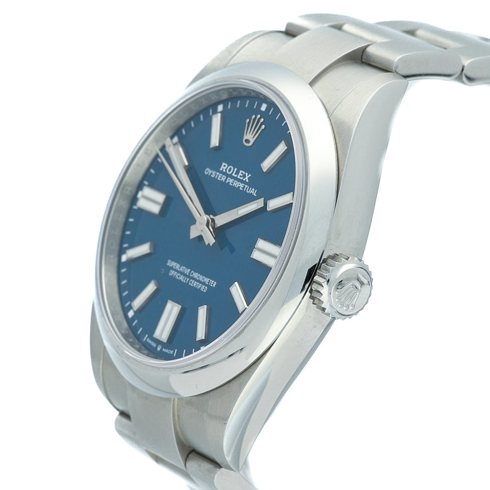 The Pre-Owned Rolex Oyster Perpetual 41 (Ref. 134300, 2025) in med-blue is the epitome of understated elegance paired with modern innovation. Its 41 mm Oystersteel case and smooth domed bezel embody Rolex’s timeless design language, while the vibrant matte lacquered blue dial adds contemporary flare. Polished white-gold baton hour markers and Chromalight hands offer superb nighttime legibility.