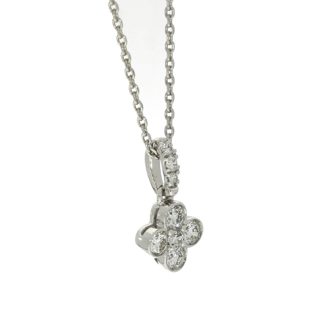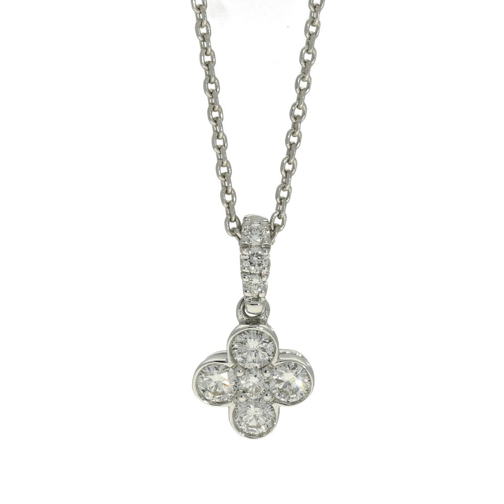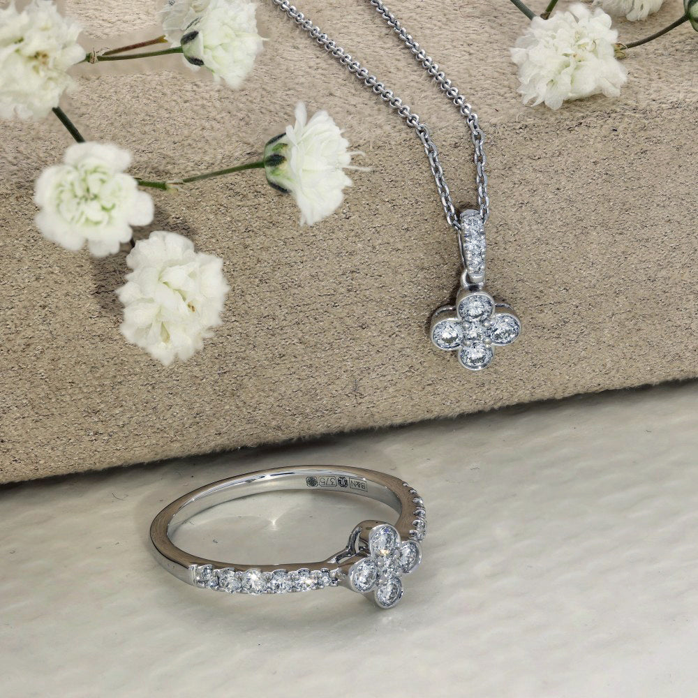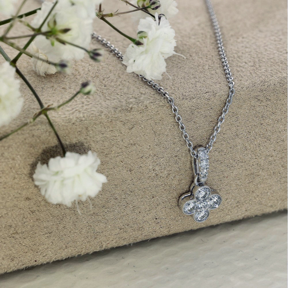 A beautifully feminine cluster pendant crafted from 9ct white gold with 0.25ct of glittering natural white round brilliant cut diamonds assessed as G/H colour and SI clarity. The quatrefoil motif, or Venetian four leaf clover, is a symbol of luck, and good fortune.