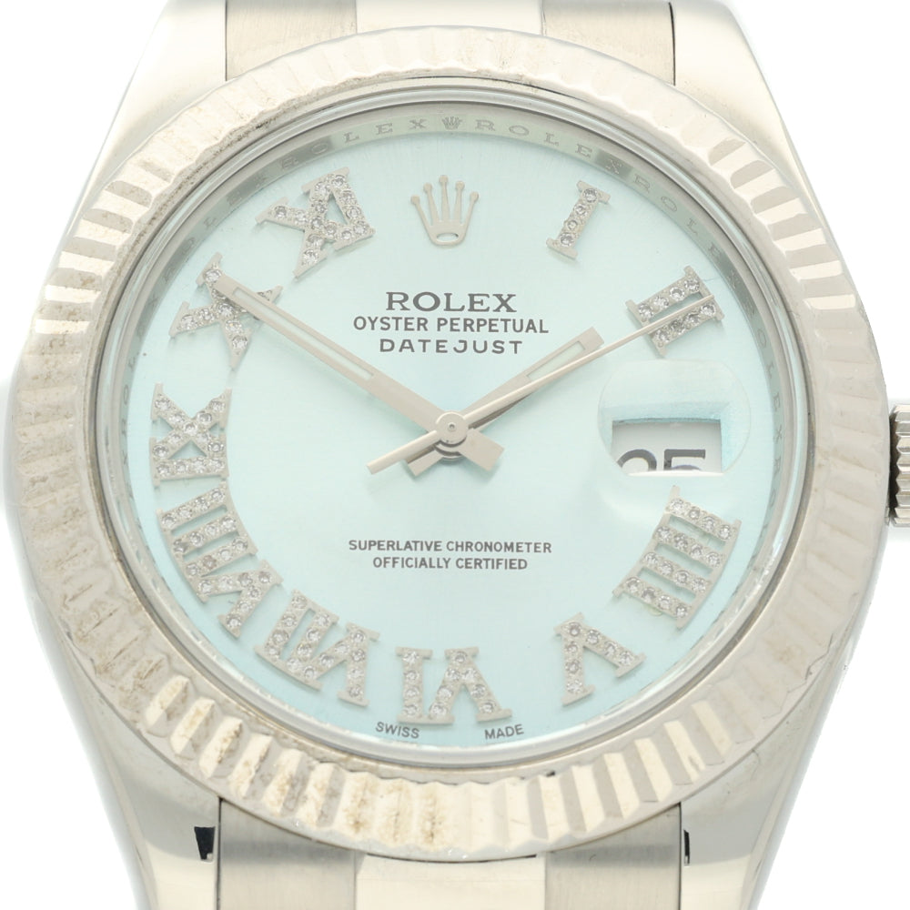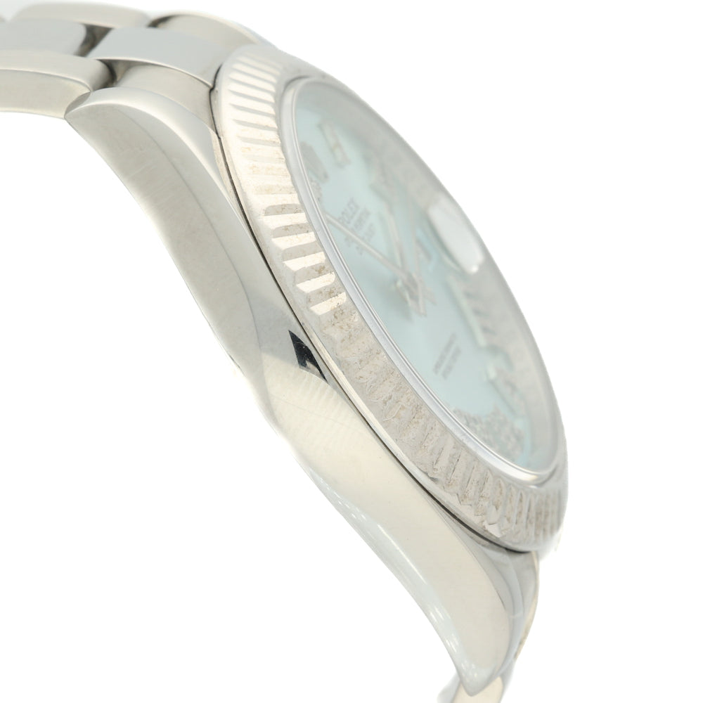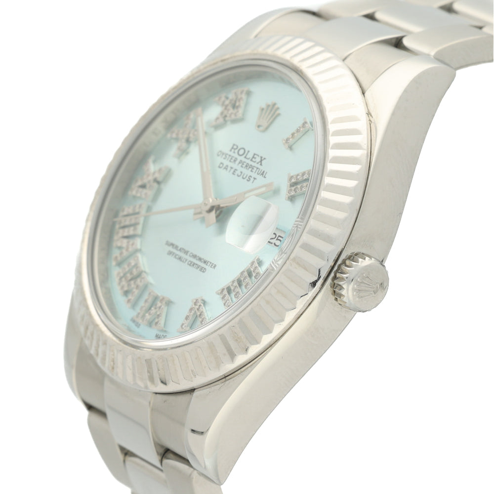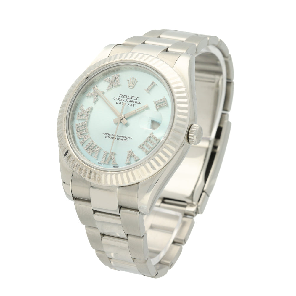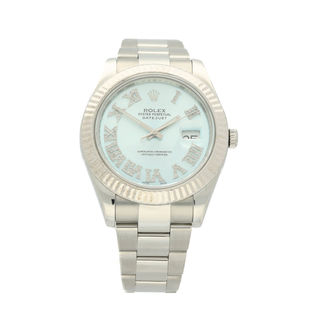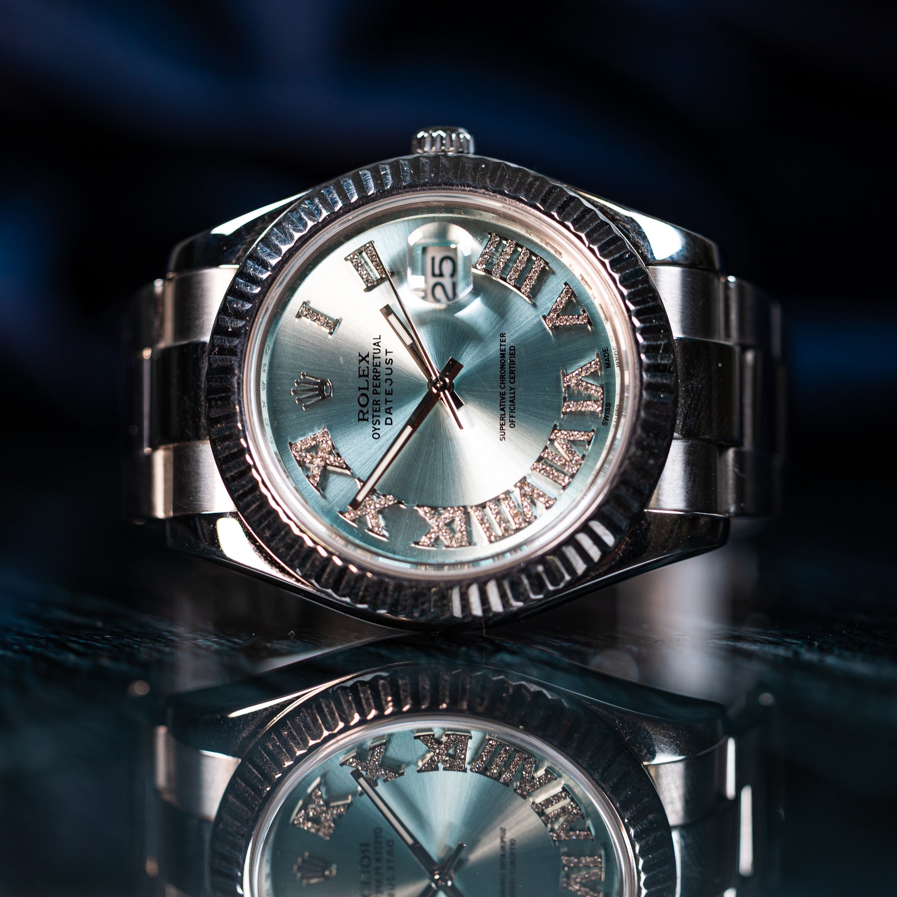 Bold, contemporary, and unmistakably prestigious, the Rolex Datejust II reference 116334 represents a modern evolution of one of horology’s most iconic designs. This particular example features a striking baby blue aftermarket sunburst dial with diamond Roman numeral hour markers, offering a unique and eye‑catching interpretation of the classic Datejust aesthetic from Rolex.
