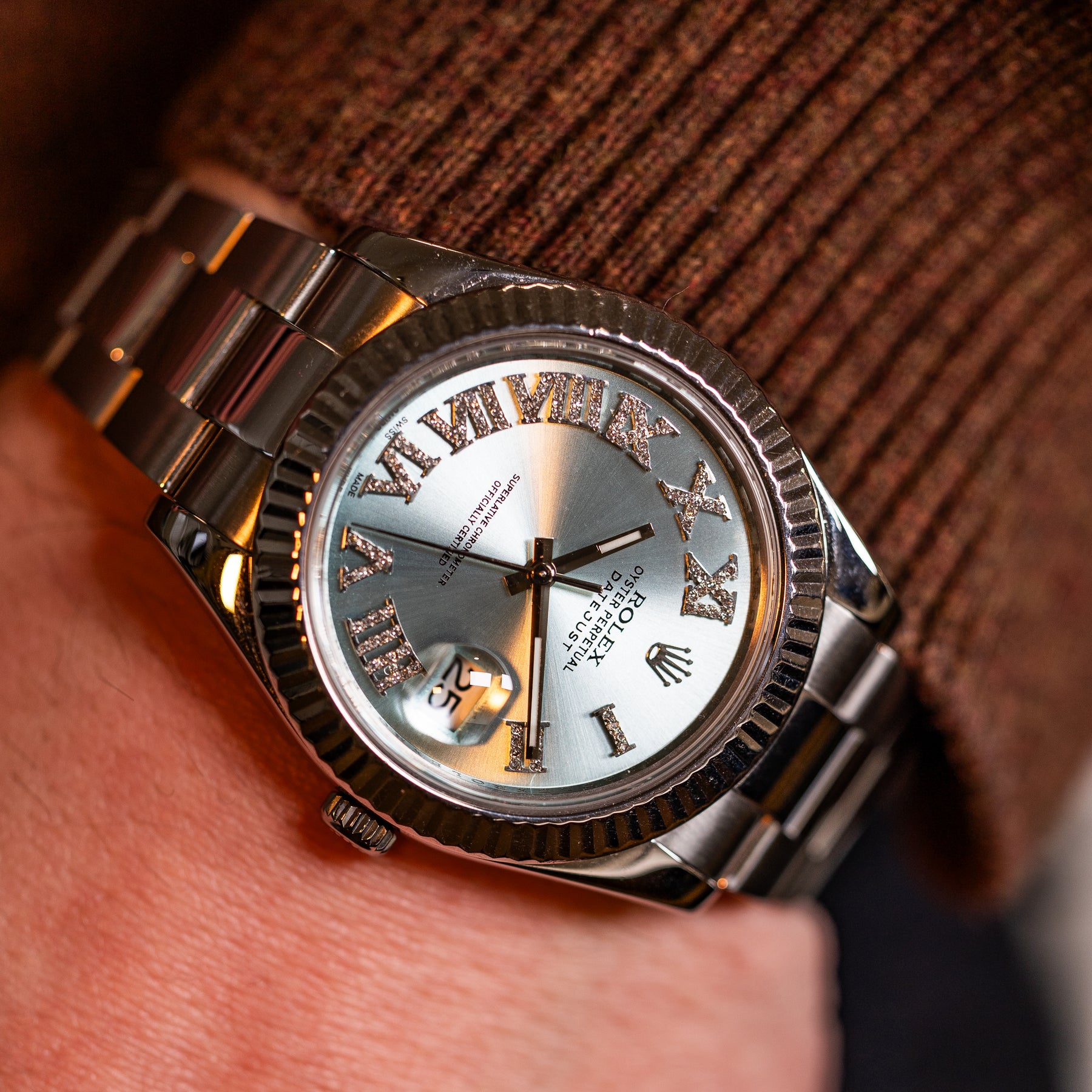 This watch features a professionally fitted aftermarket diamond dial, which gives it a distinctive appearance not offered by the manufacturer. While visually striking, aftermarket components can influence collectability and resale considerations compared to factory‑original examples.