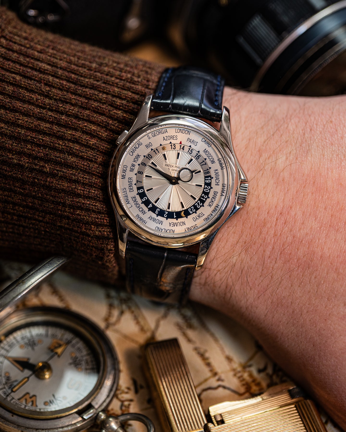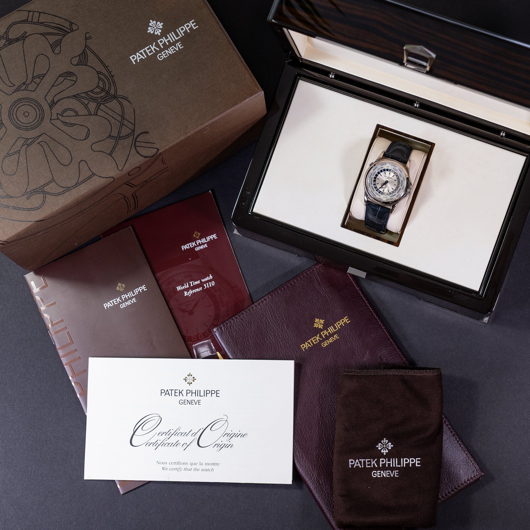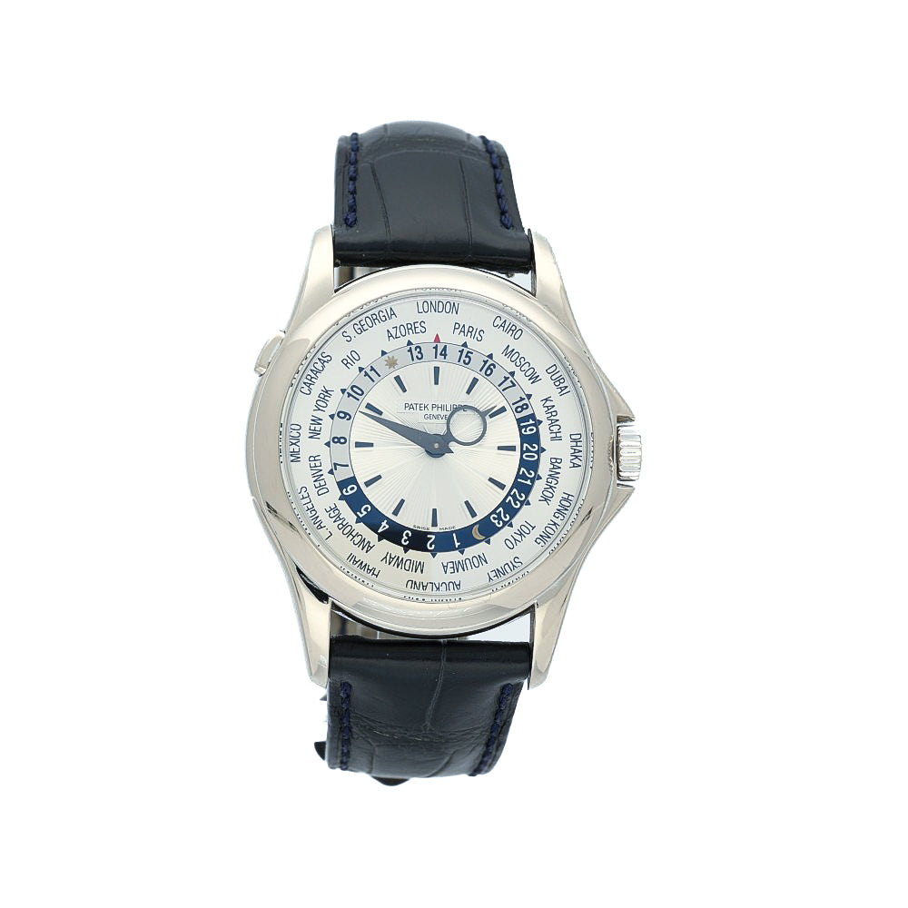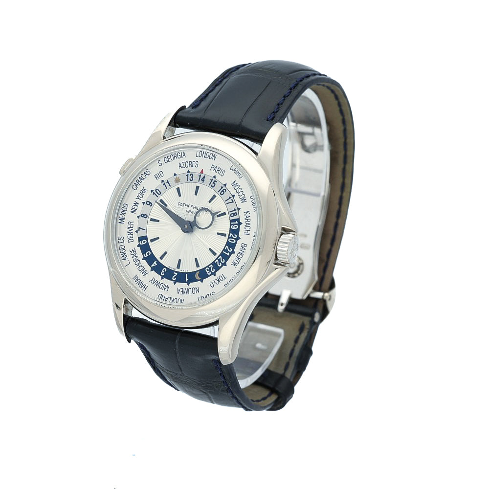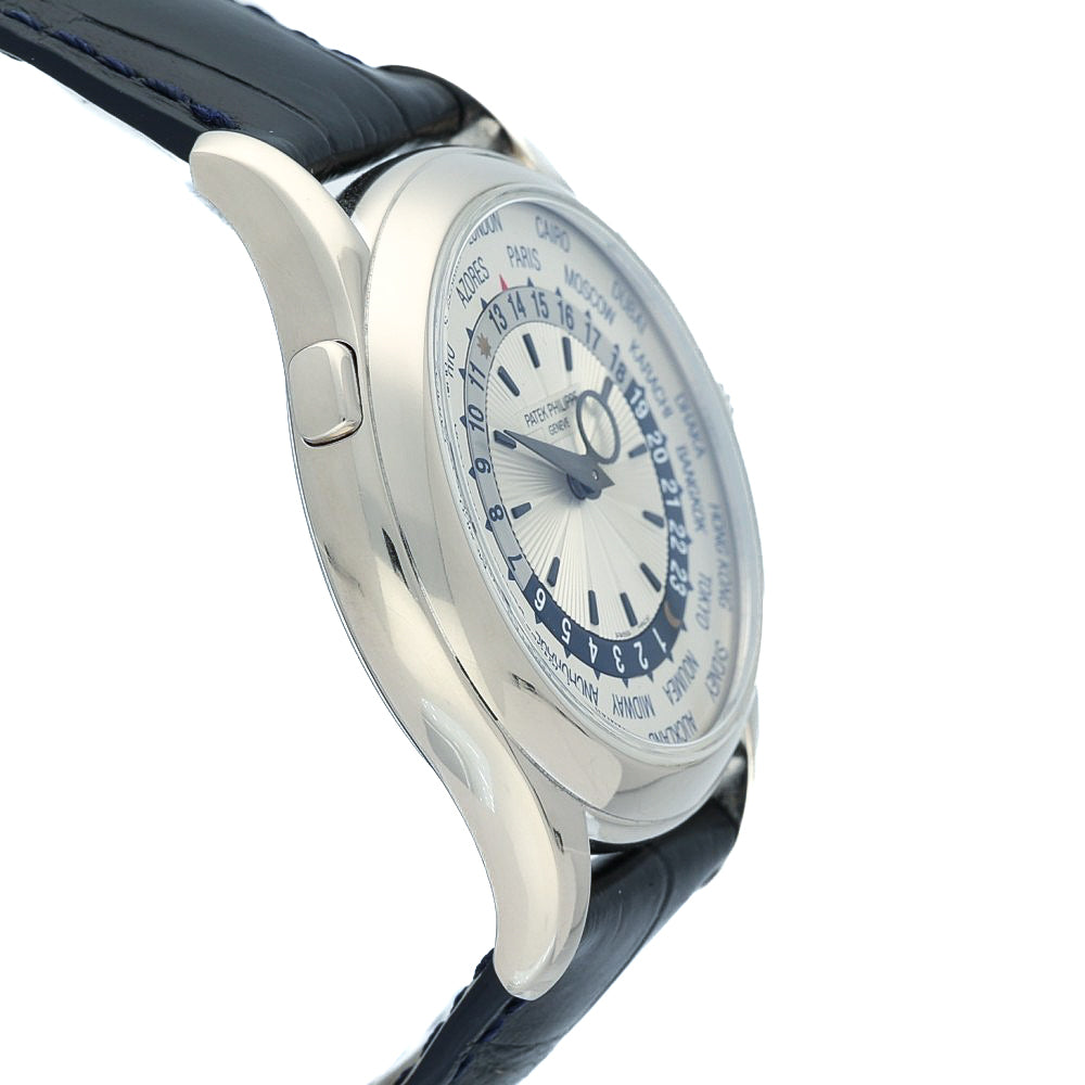 The Patek Philippe Ref. 5130G World Time is a masterpiece of horology, combining elegance with technical sophistication. Introduced as part of Patek Philippe’s iconic World Time collection, this 2007 model features a 39.5 mm white gold case, offering a refined yet substantial presence on the wrist. Its dial showcases a stunning silver guilloche centre, surrounded by a city ring that allows the wearer to track 24 time zones simultaneously—a hallmark of Patek’s world time complication.