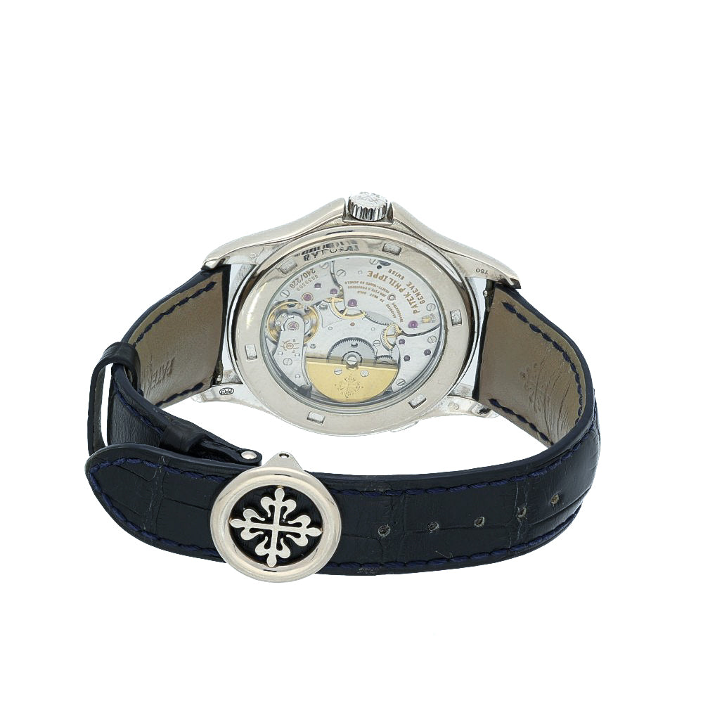 At its heart beats the Calibre 240 HU, an ultra-thin automatic movement equipped with a 22k gold micro-rotor, ensuring both precision and elegance. The transparent sapphire case back reveals the intricate finishing and craftsmanship synonymous with Patek Philippe.