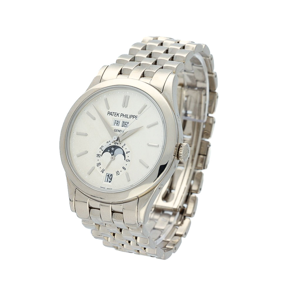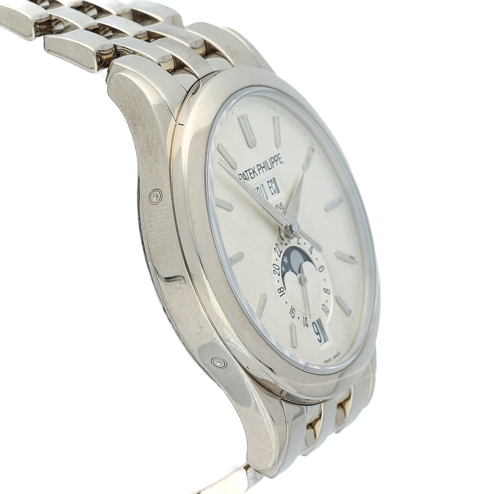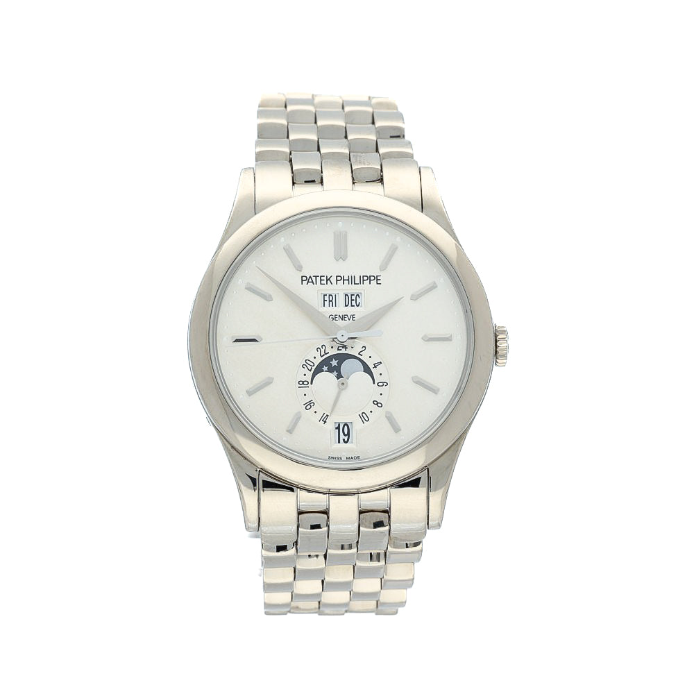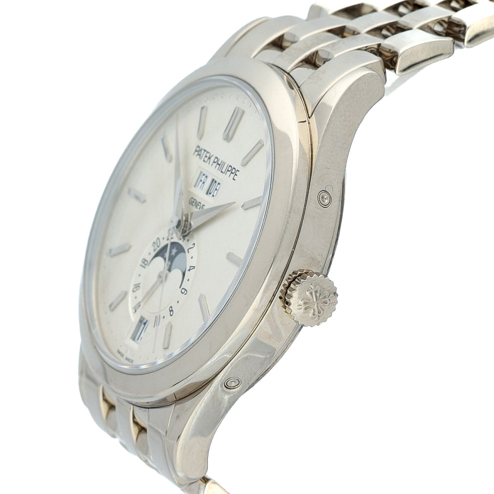 Elegance with everyday intelligence. The 5396/1G‑010 pairs Patek’s Calatrava‑style proportions (38.5 mm) with a full 18k white‑gold bracelet, delivering dress‑sport versatility and unmistakable wrist presence. The silvery opaline dial is classic Patek: day/month windows at 12, a clean date at 6, and a beautifully executed moon‑phase with a 24‑hour scale—balanced, legible, and refined.