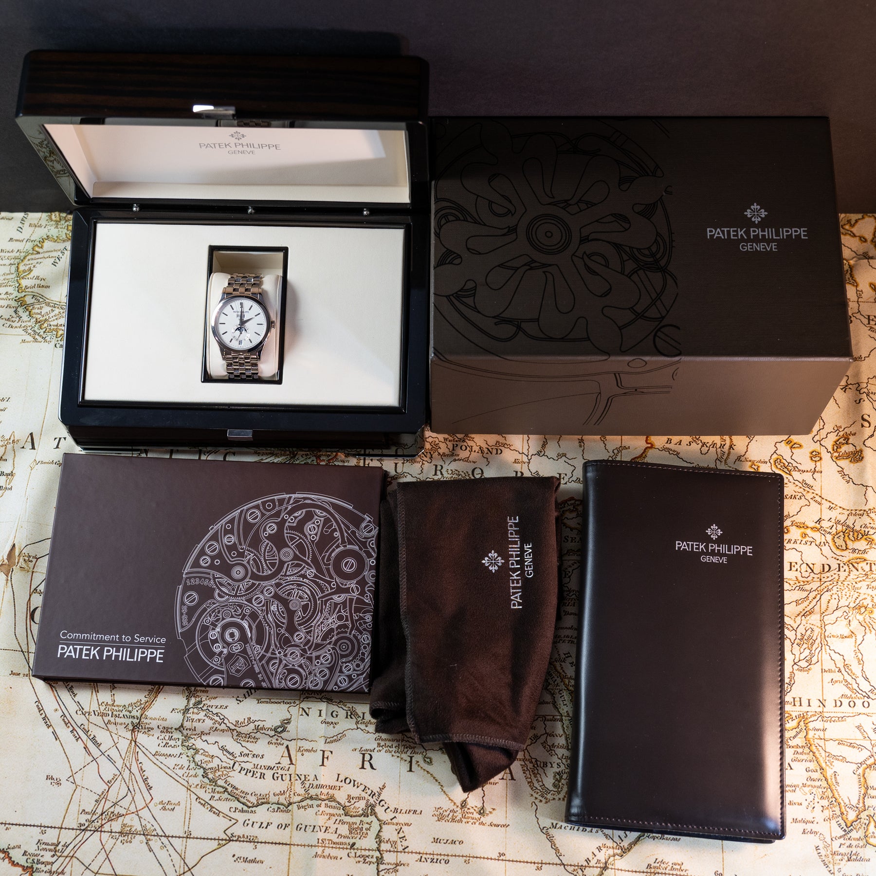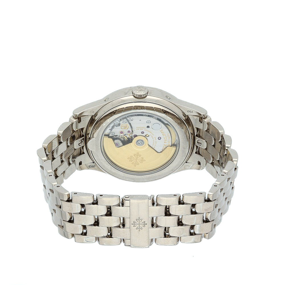 Finished in white gold throughout, the factory five‑row bracelet and fold‑over clasp elevate the watch from formal to exceptional, making this full‑set 5396/1G‑010 a complete and highly desirable package for collectors seeking pre‑owned, boxed, with papers provenance.