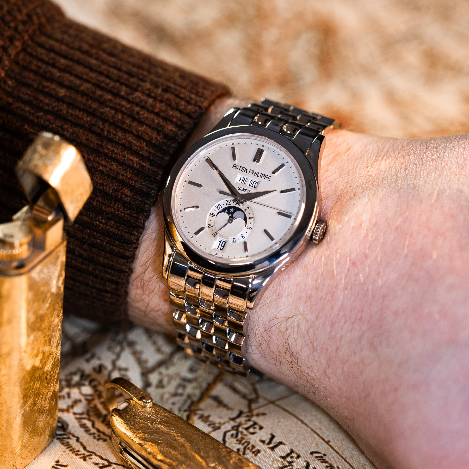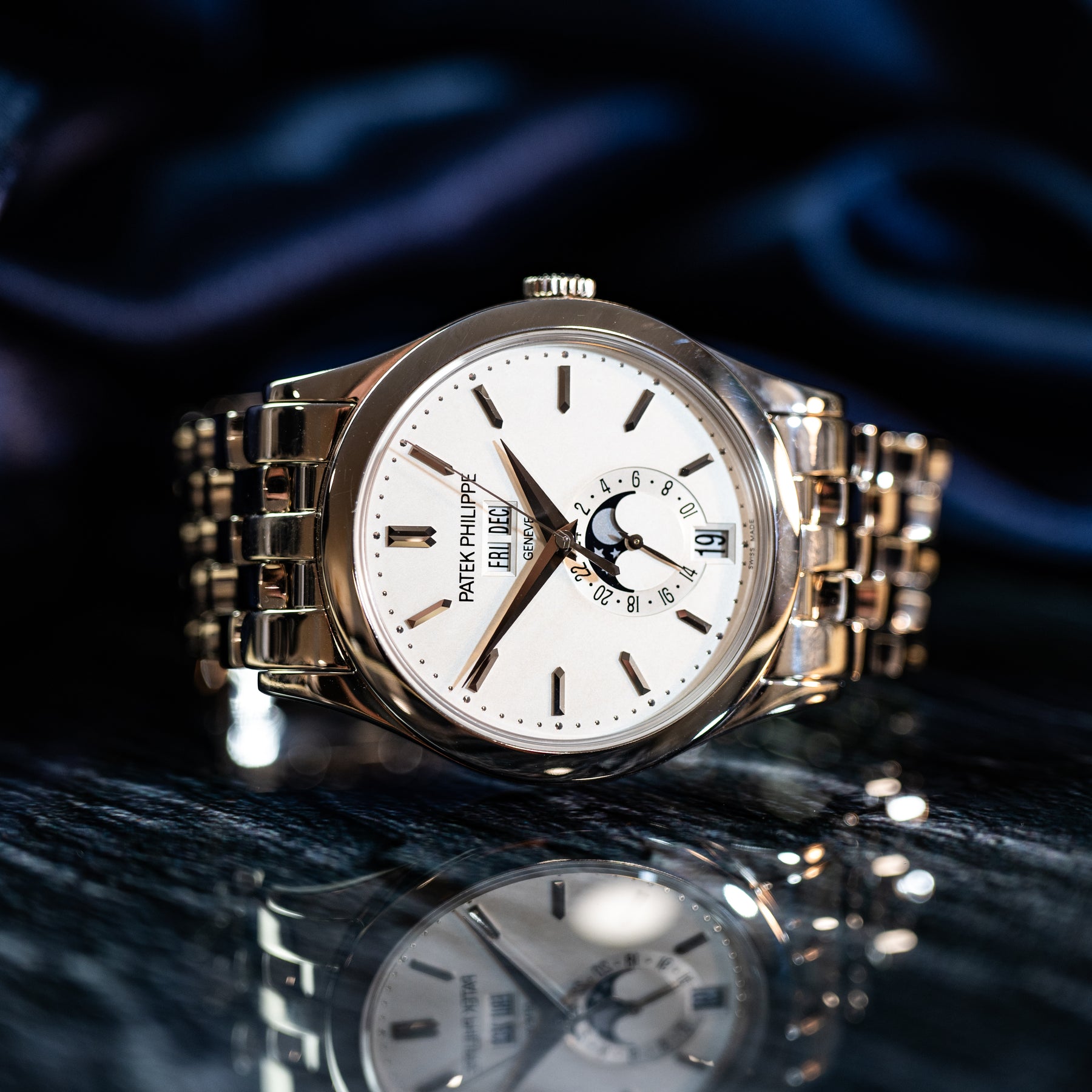 Calendar mechanism: Patek’s Annual Calendar automatically accounts for 30/31‑day months and needs only one correction per year (March 1); moon‑phase accuracy is to ~122 years between corrections.