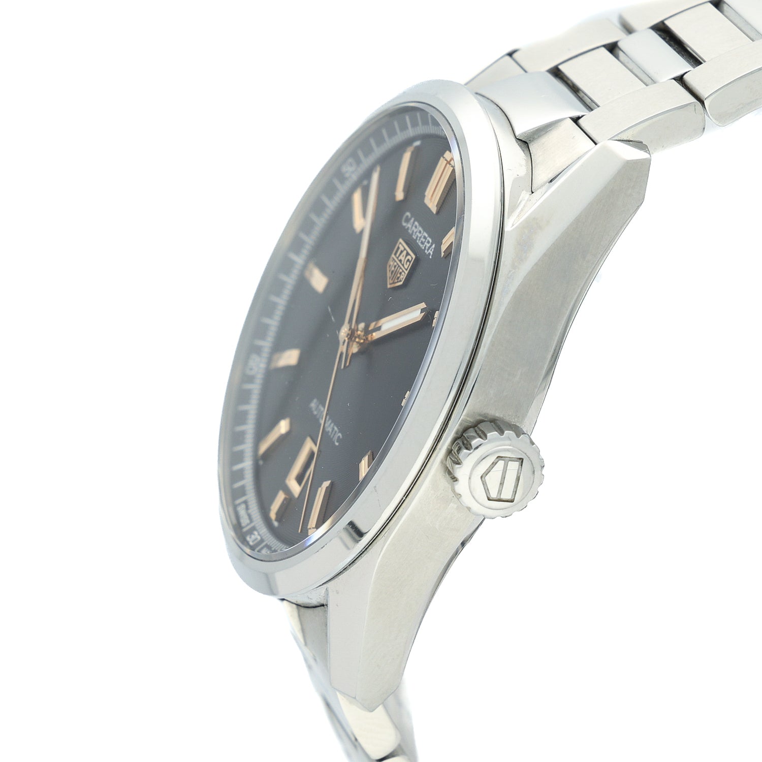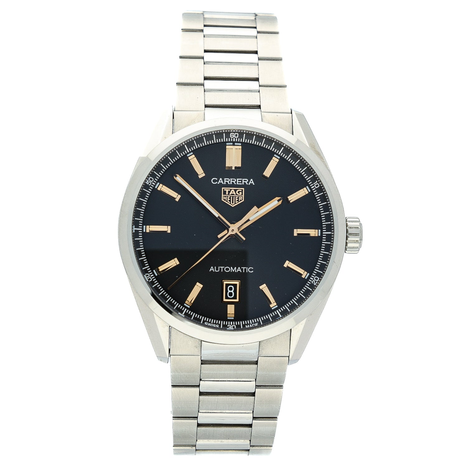 The perfectly proportioned 39mm stainless steel case offers superb wrist presence without feeling oversized, protected by a sapphire crystal and fitted with a TAG Heuer push/pull crown. The watch is paired with a stainless steel three‑link bracelet, giving it a sporty yet smart appearance suitable for both daily wear and formal settings.