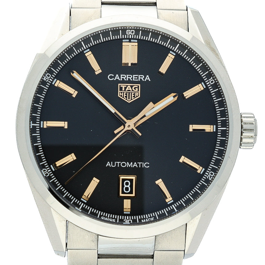 This 2022 example is presented in like new condition and is supplied as a full set with its original box and papers. The watch features a striking black dial accented by applied gold baton hour markers, creating a refined contrast that elevates the classic Carrera aesthetic.