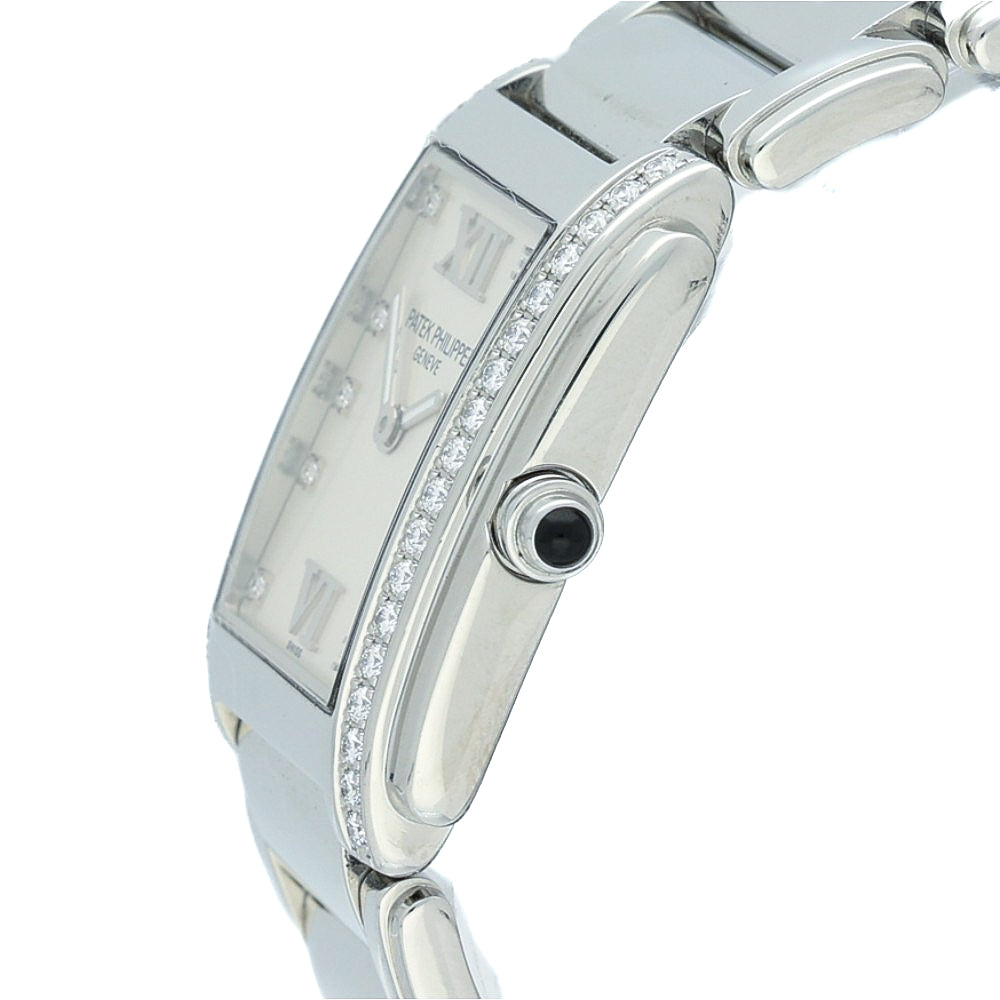This Ref. 4910/10A-011, crafted in polished stainless steel, features the signature rectangular case measuring 25mm x 30mm, adorned with two vertical rows of brilliant-cut diamonds on the bezel for a touch of refined glamour. Its silvered dial showcases Roman numerals at 12 and 6, complemented by diamond hour markers and delicate dauphine hands, all protected by a scratch-resistant sapphire crystal.
