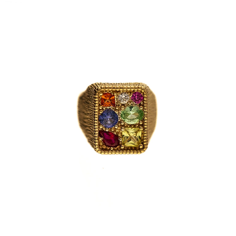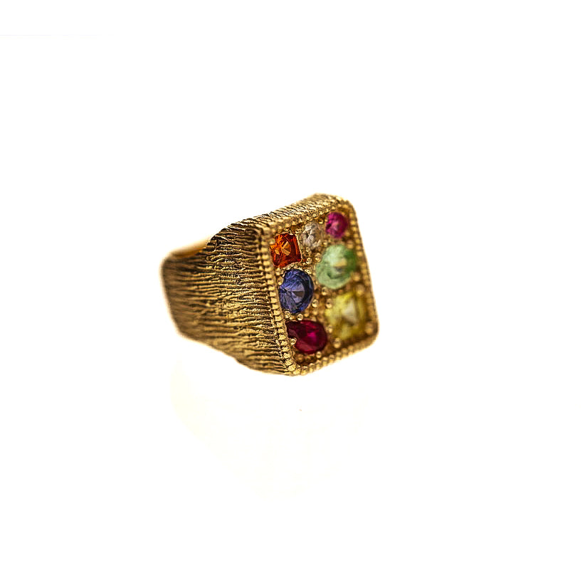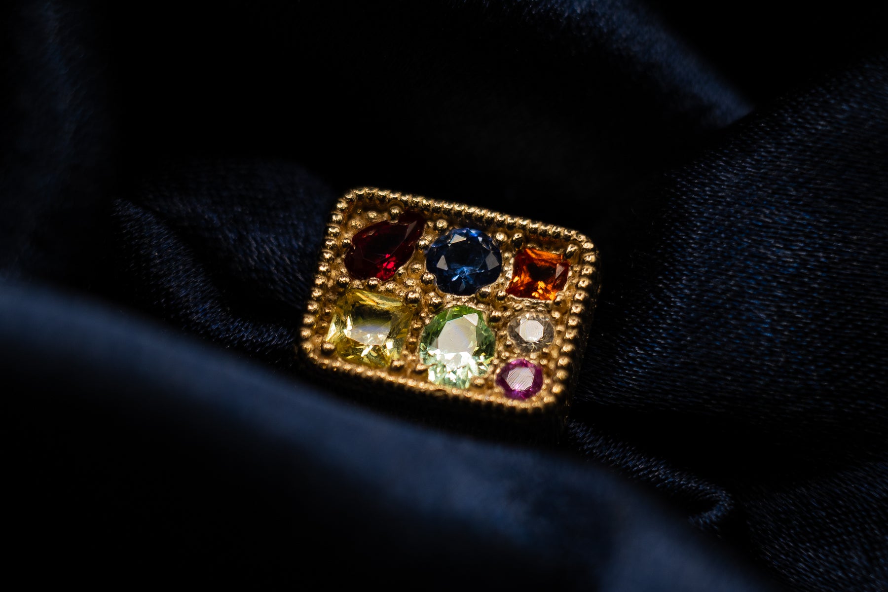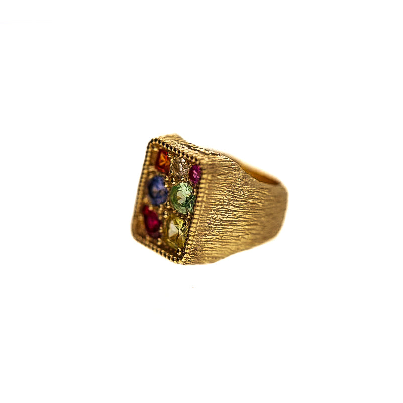 A rectangular signet that contrasts rich, textured sides with an array of seven syntheitc sapphires in varied colours and cuts — each one adding its own unique gleam and character.