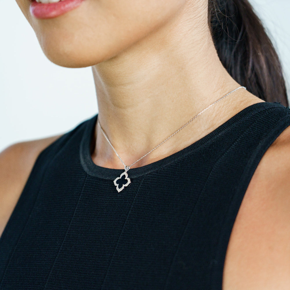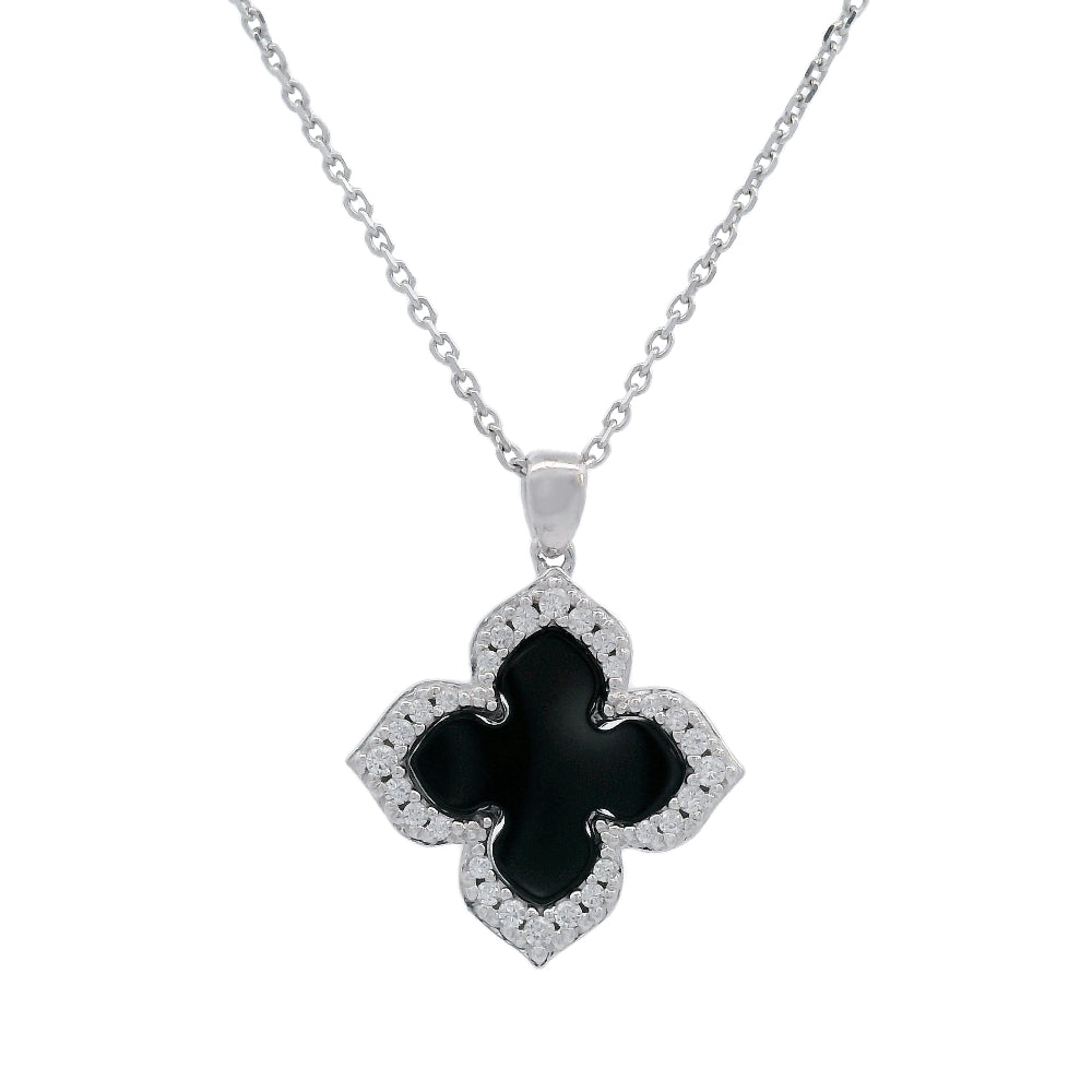 Crafted from 18k gold e-coated 925 sterling silver, this stunning pendant features a striking black agate four-leaf clover measuring 17mm high by 15.65mm wide, with a pointed silhouette that symbolises luck and grace.