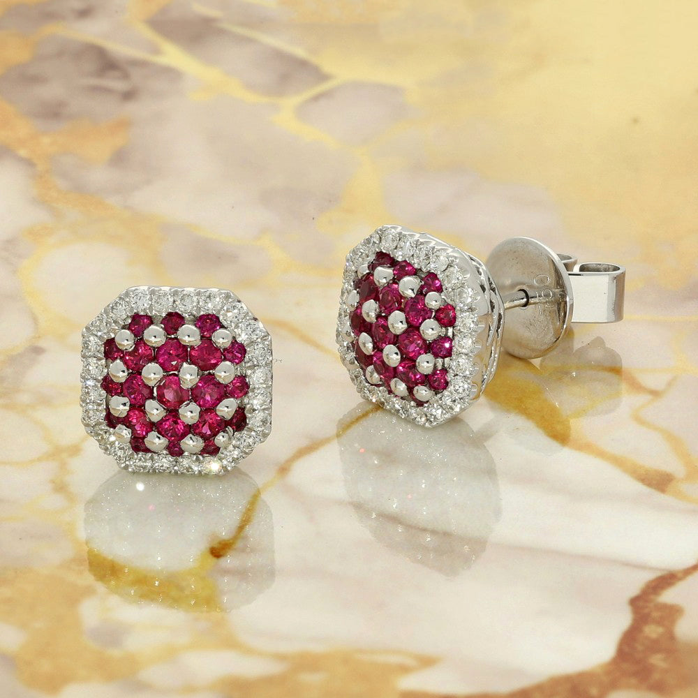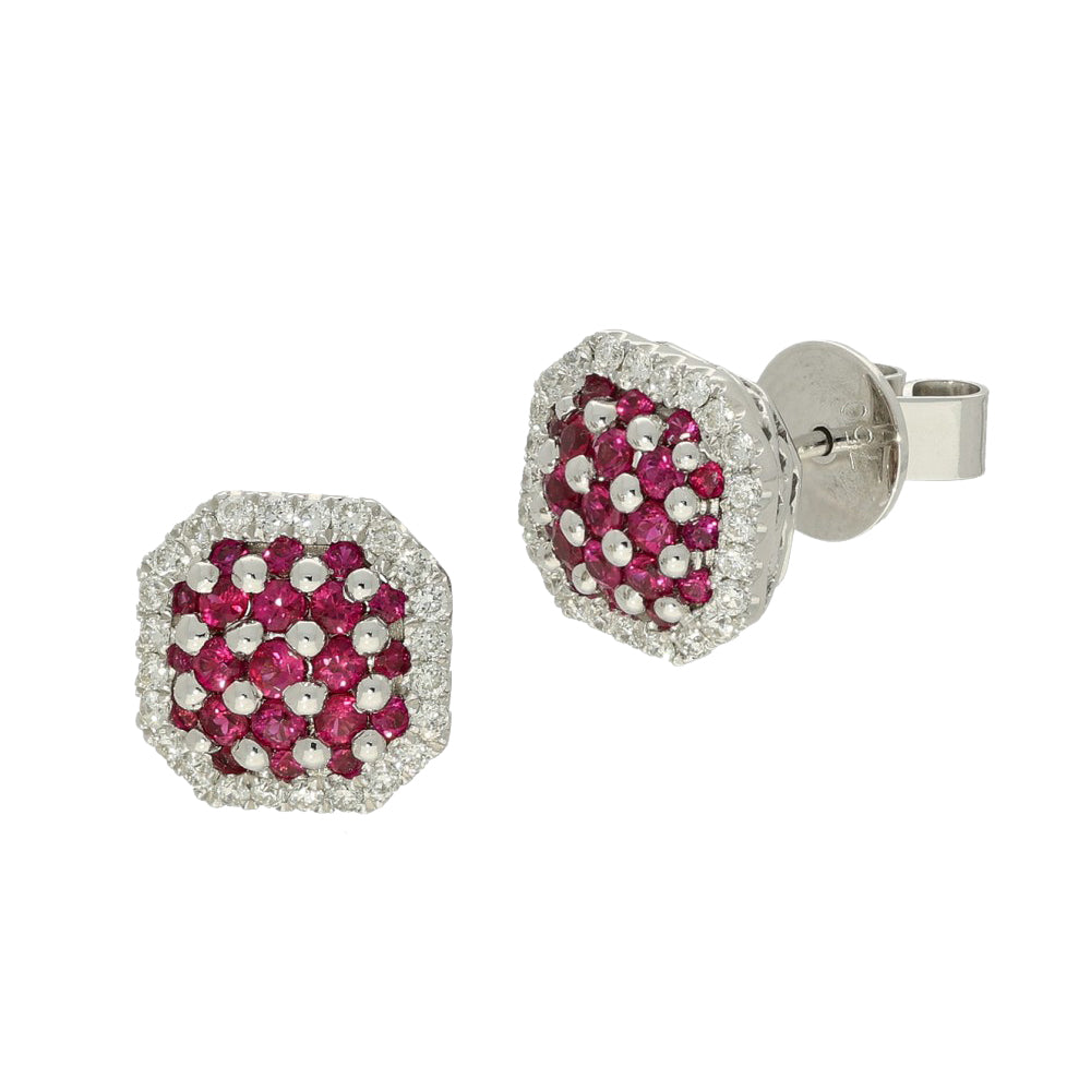 18ct White Gold Ruby and Diamond Octagonal Cluster Stud Earrings