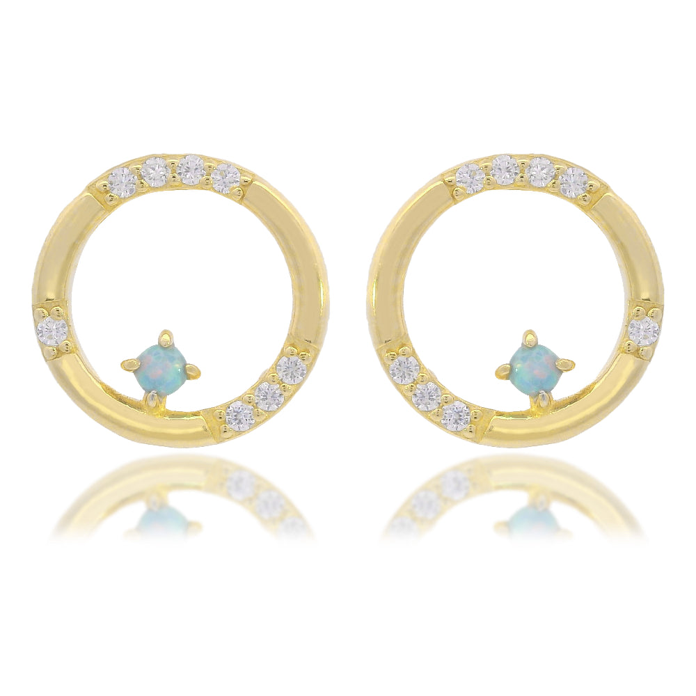 The Open Circle Earrings are a timeless everyday classic, and the new Circle Earrings from the Opal Glow Collection offer a fresh spin on this beloved design. These earrings showcase a beautifully created blue opal floating in a 12mm circle, accented by sparkling white cubic zirconia for a touch of brilliance. Crafted from 18k Gold-Plated 925 Sterling Silver and finished with E-coating for added durability, they're the perfect way to add a hint of elegance to your daily look.