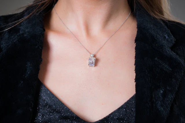Beautiful bubbles of delicious colour blossom over a stunning emerald cut Cubic Zirconia. Pop at every party with this tantalizing new design that features the softest pastel hues. Crafted in luxurious Rhodium Plated 925 Sterling Silver the pendant measures approximately 20.5mm long by 9.7mm wide and comes on a 41cm chain with a 5cm extension.