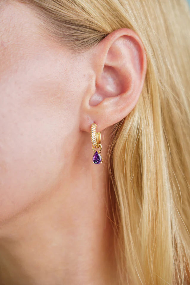 Crafted with care from 18ct gold e-coated 925 sterling silver, the Georgini Duo earrings are the perfect harmony of elegance and versatility. Delicately designed, they feature dazzling pear-shaped cubic zirconia charms (7 x 5 mm) in this season’s colour, Amethyst, which can be effortlessly removed to reveal two stunning styles. The shimmering pave-set cubic zirconia hoops, measuring approximately 12 mm, add a graceful sparkle that catches the light from every angle. Whether worn as a refined statement or a subtle shimmer, these earrings elevate any outfit with timeless charm and modern sophistication.