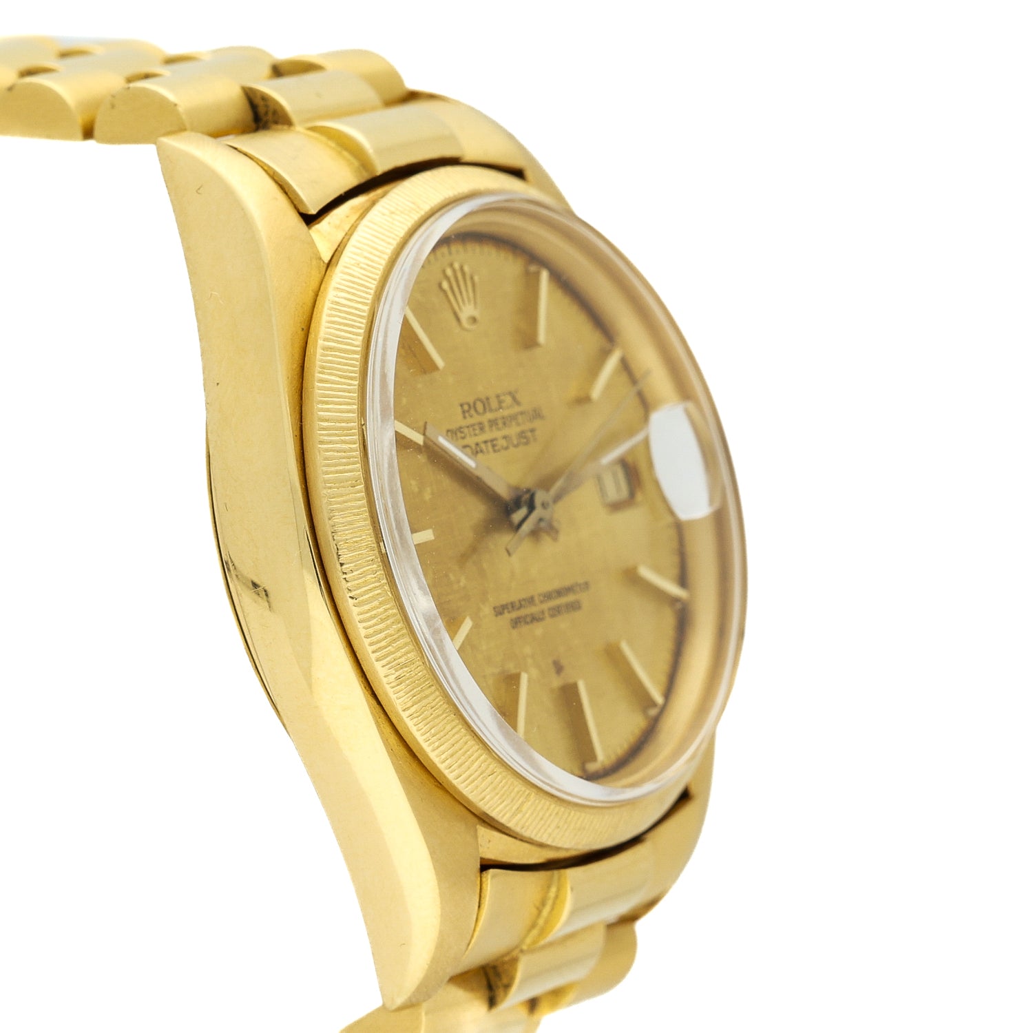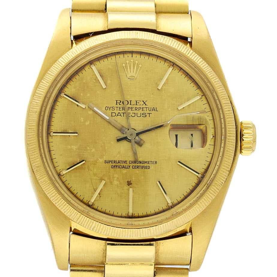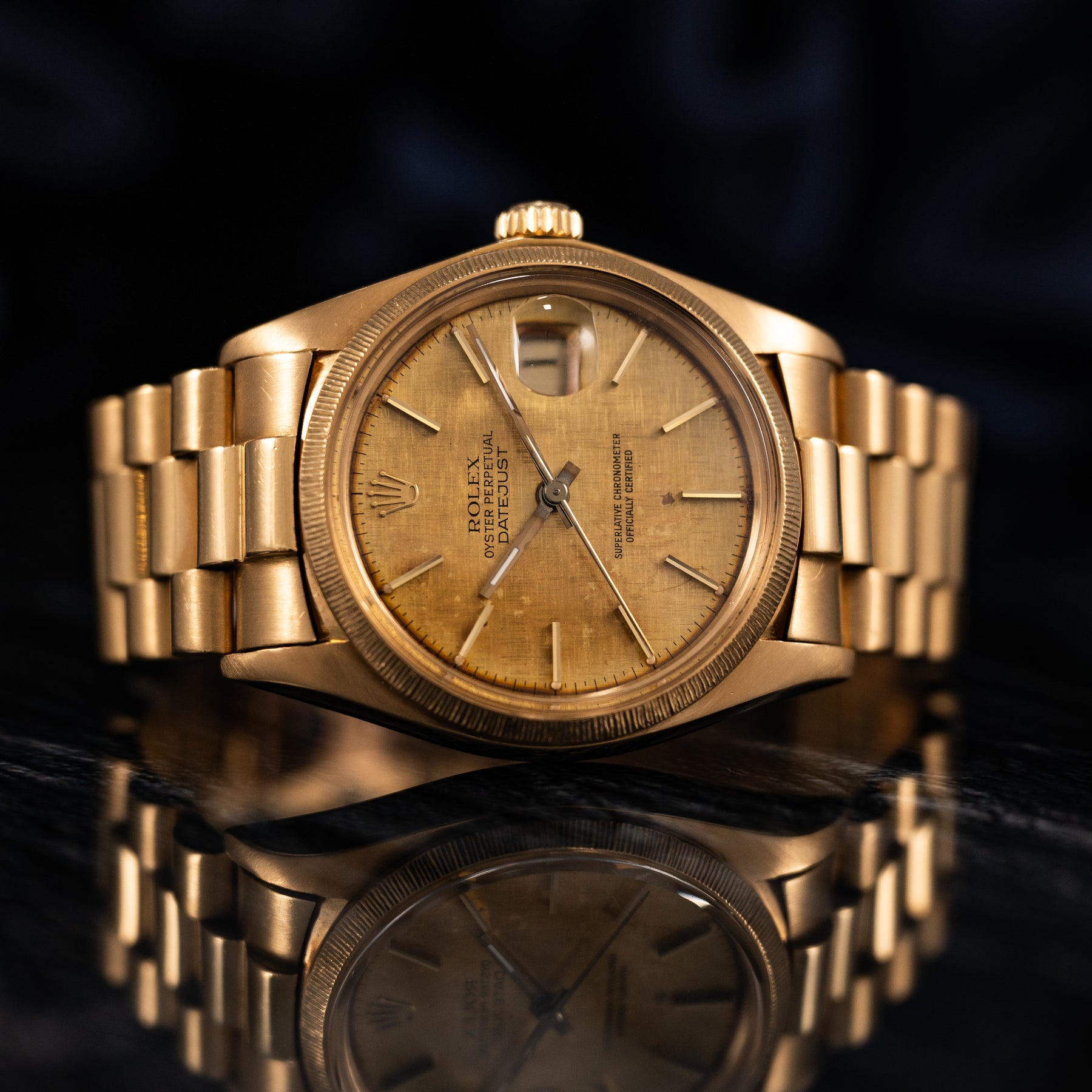 This reference is perfect for those seeking a vintage solid gold Rolex with real character. The 18k bark finished bezel and patina on the dial sets this piece apart from standard steel and bi-metal Datejust models, making it an eye‑catching and uncommon piece that represents a unique era of Rolex design.