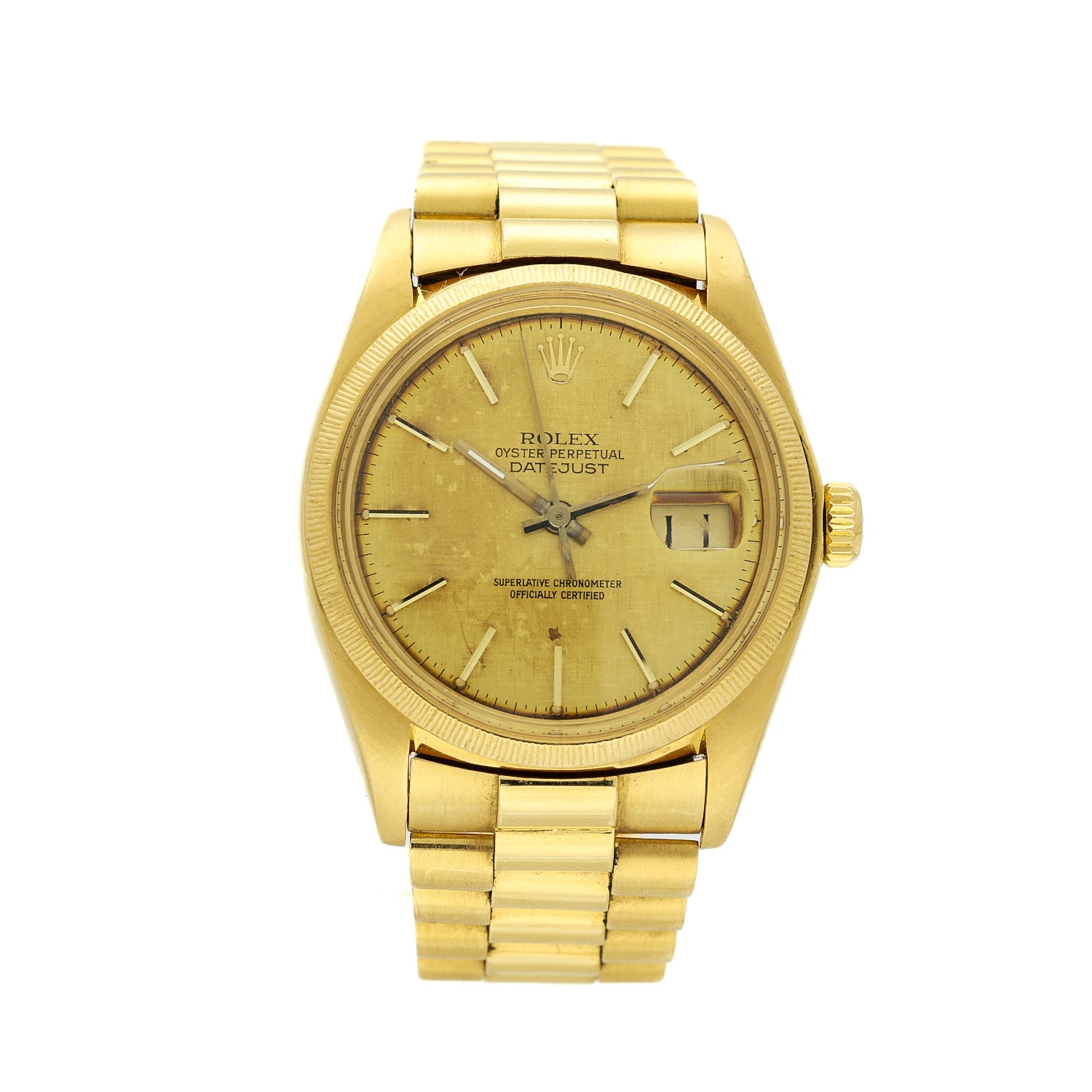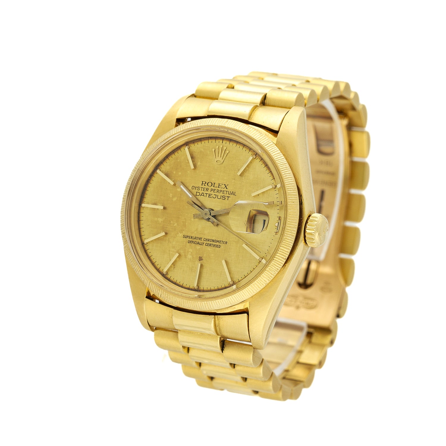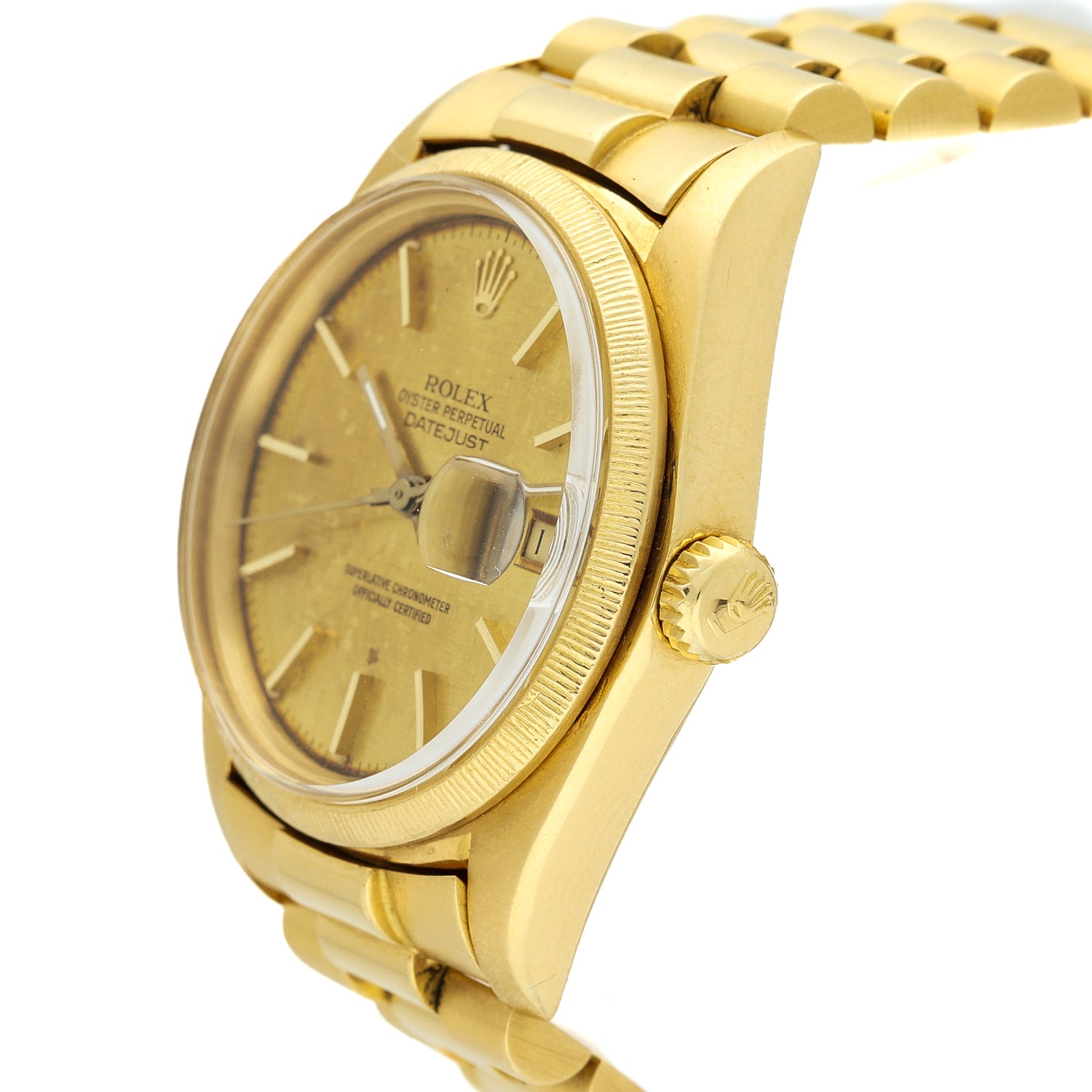 This reference is perfect for those seeking a vintage solid gold Rolex with real character. The 18k bark finished bezel and patina on the dial sets this piece apart from standard steel and bi-metal Datejust models, making it an eye‑catching and uncommon piece that represents a unique era of Rolex design.