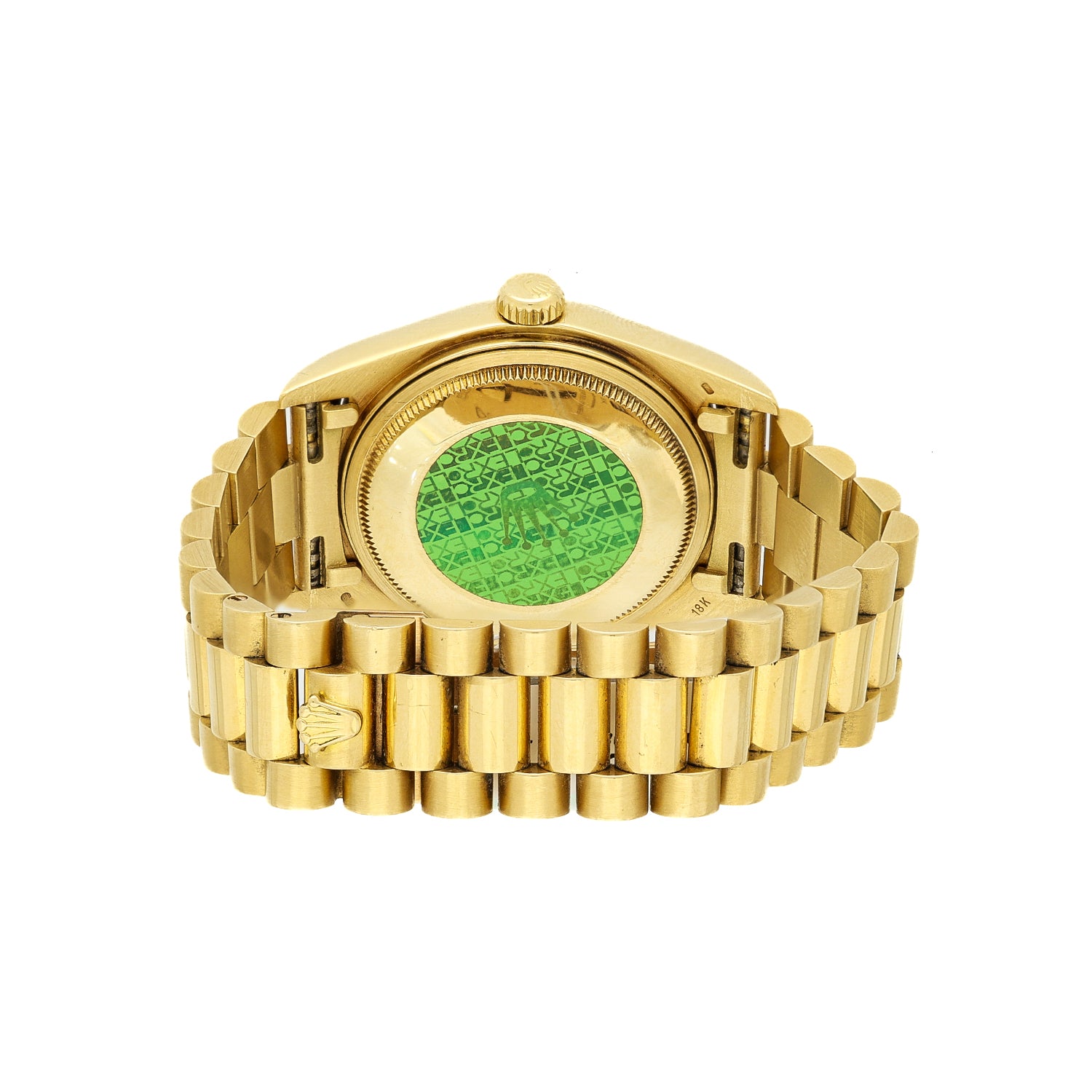 The 36mm 18ct yellow gold case is fitted with a Rolex screw‑down crown and protected by its original style acrylic crystal, maintaining the authentic vintage character of this reference. The watch is paired with the iconic Rolex 18ct yellow gold President bracelet, offering both comfort and unmistakable presence on the wrist.