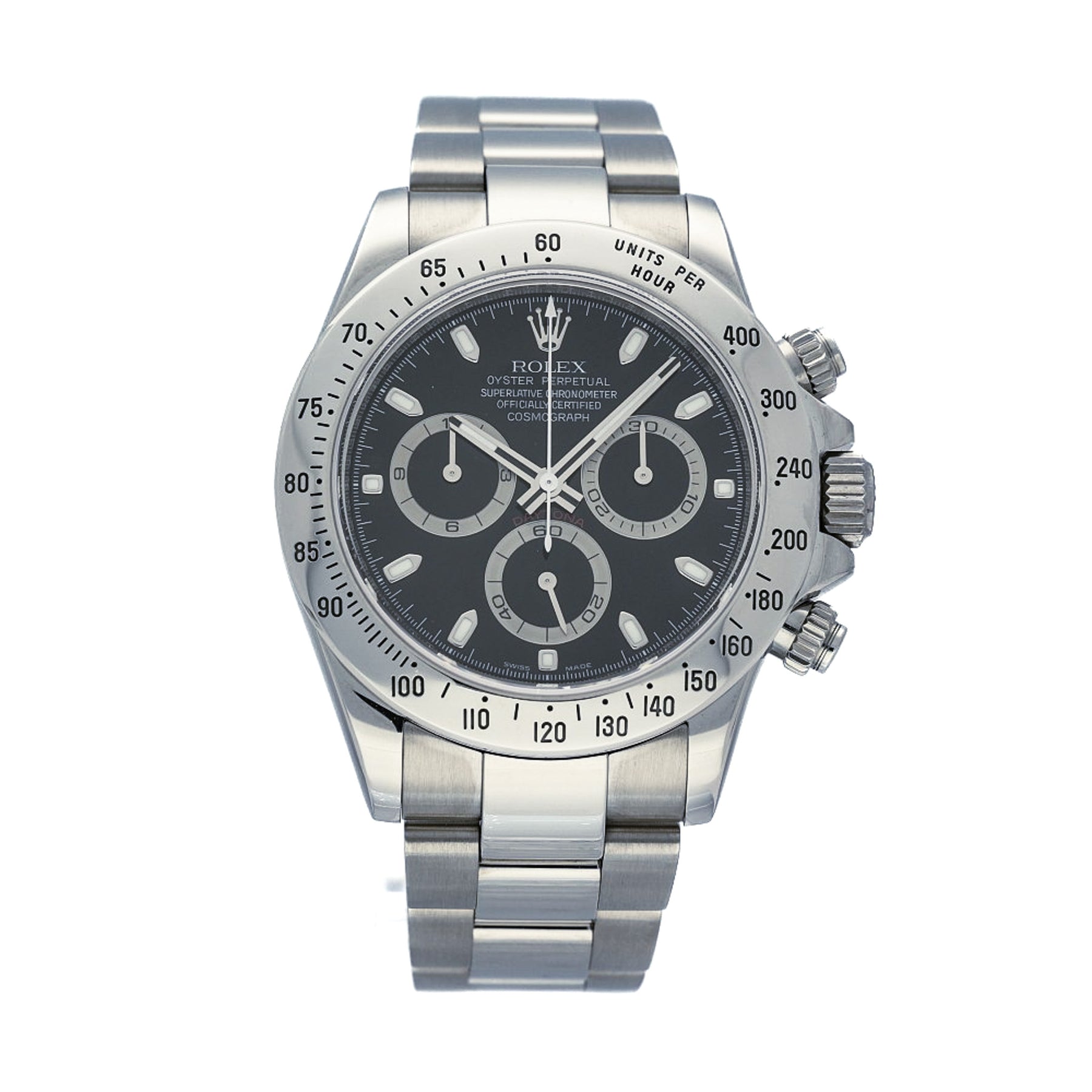 This 2008 example features the classic and highly desirable black dial, complemented by applied 18ct white gold luminous baton hour markers for excellent visibility. The polished steel bezel and 40mm Oyster case create a clean, modern aesthetic that remains one of the most recognisable sports-chronograph designs in the world.